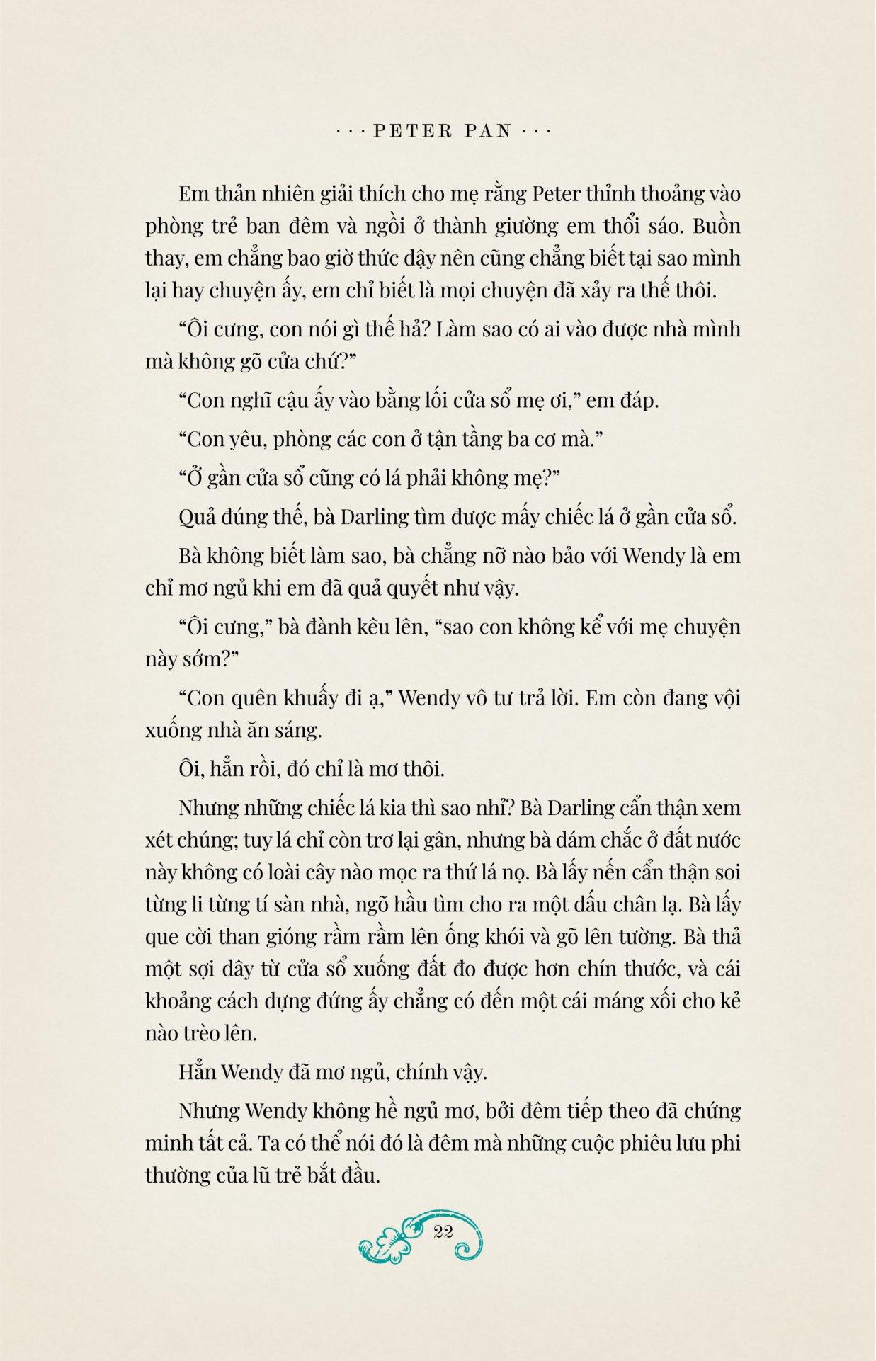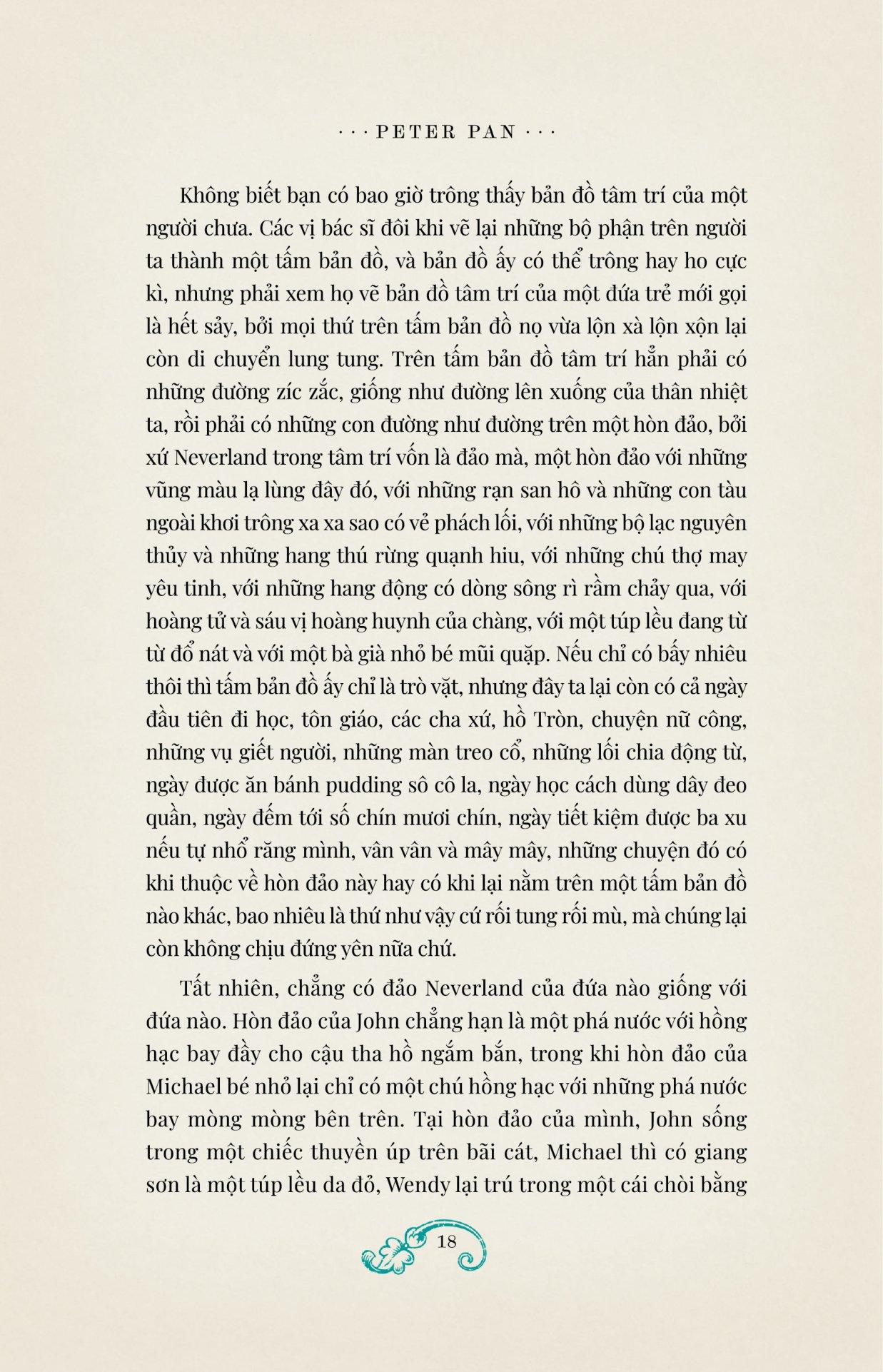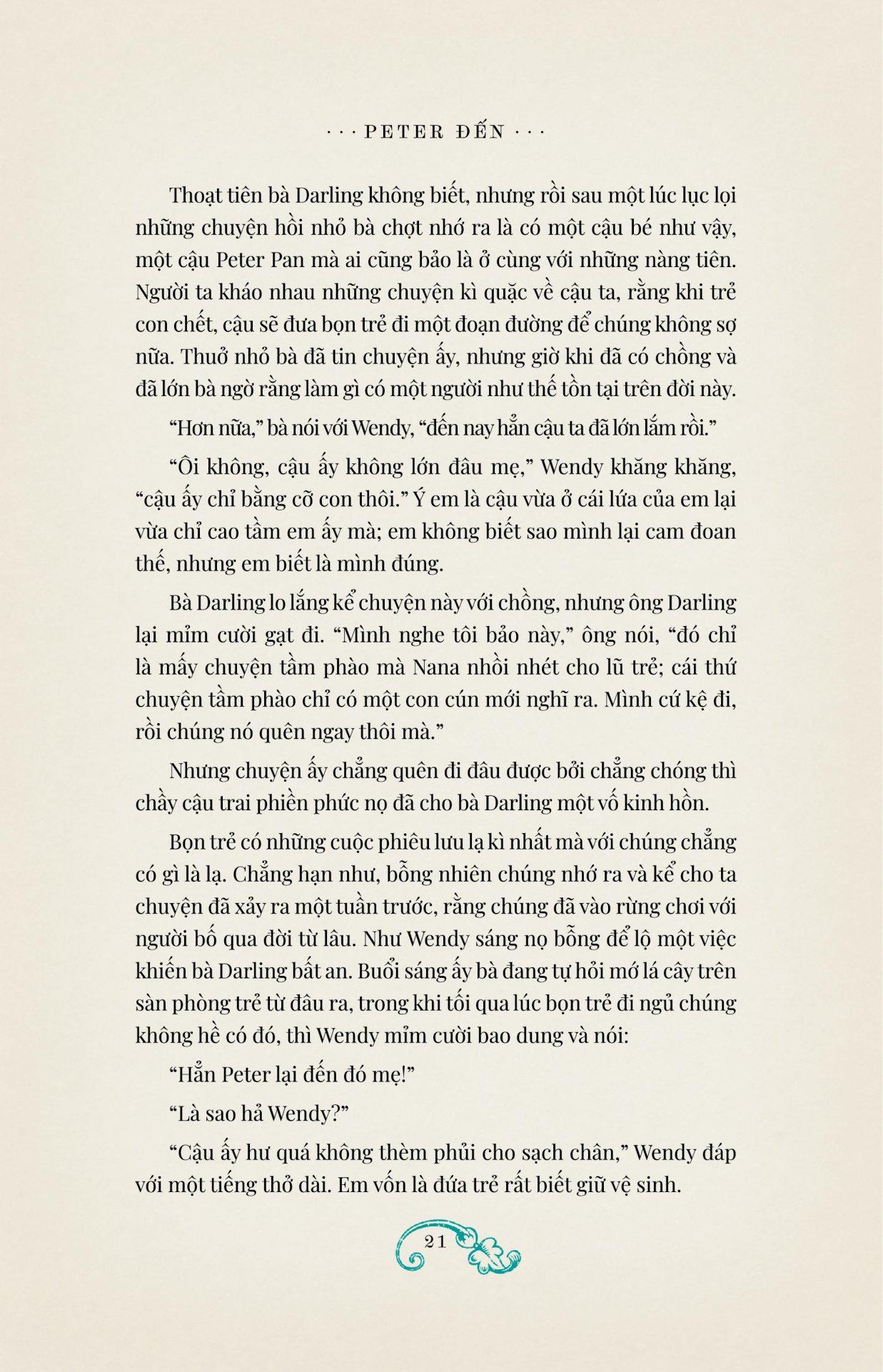 Ra đời cách nay đã hơn một trăm năm, câu chuyện về cậu bé Peter Pan quả cảm, biết bay và không bao giờ chịu lớn đã chinh phục mọi độc giả trẻ thơ và độc giả đã đi qua tuổi thơ. Một câu chuyện lấp lánh phép mầu song lại chẳng phải cổ tích, dành cho trẻ em, cho cả những người lớn biết rằng m.ình đã lớn, ngoái trông lại tuổi thơ với nụ cười tiếc nhớ, bâng khuâng.