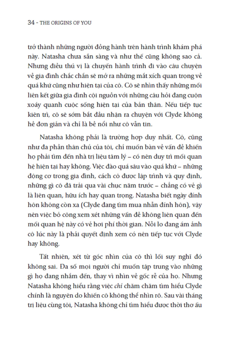 Qua từng chương sách, Vienna Pharaon sẽ dẫn dắt chúng ta khám phá từng loại trong số các vết thương do câu chuyện cội nguồn gây ra. Đồng thời, cô cũng hướng dẫn bạn chữa lành vết thương của mình với phương pháp Chữa lành tận gốc gồm bốn bước: xác định vết thương, bằng chứng về nó, nỗi tiếc thương đi kèm với nó, và cuối cùng là thực hiện những thay đổi lâu dài để không lặp lại những khuôn mẫu mà bạn vẫn cố phá vỡ trong các mối quan hệ ở tuổi trưởng thành.