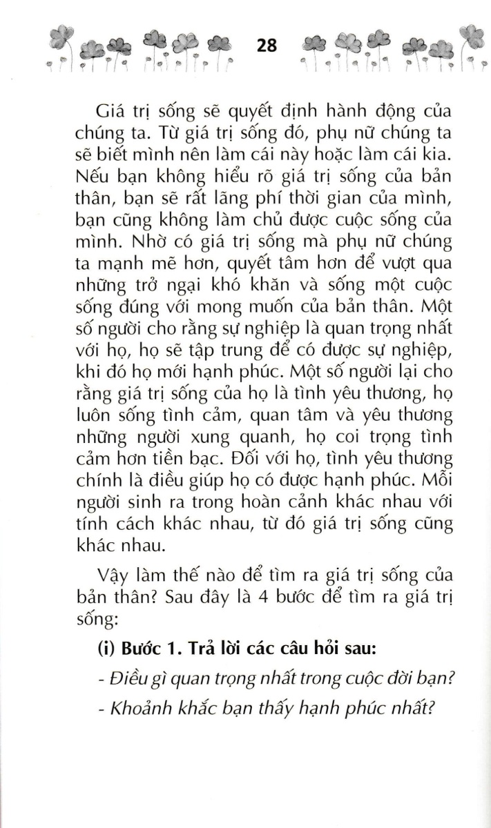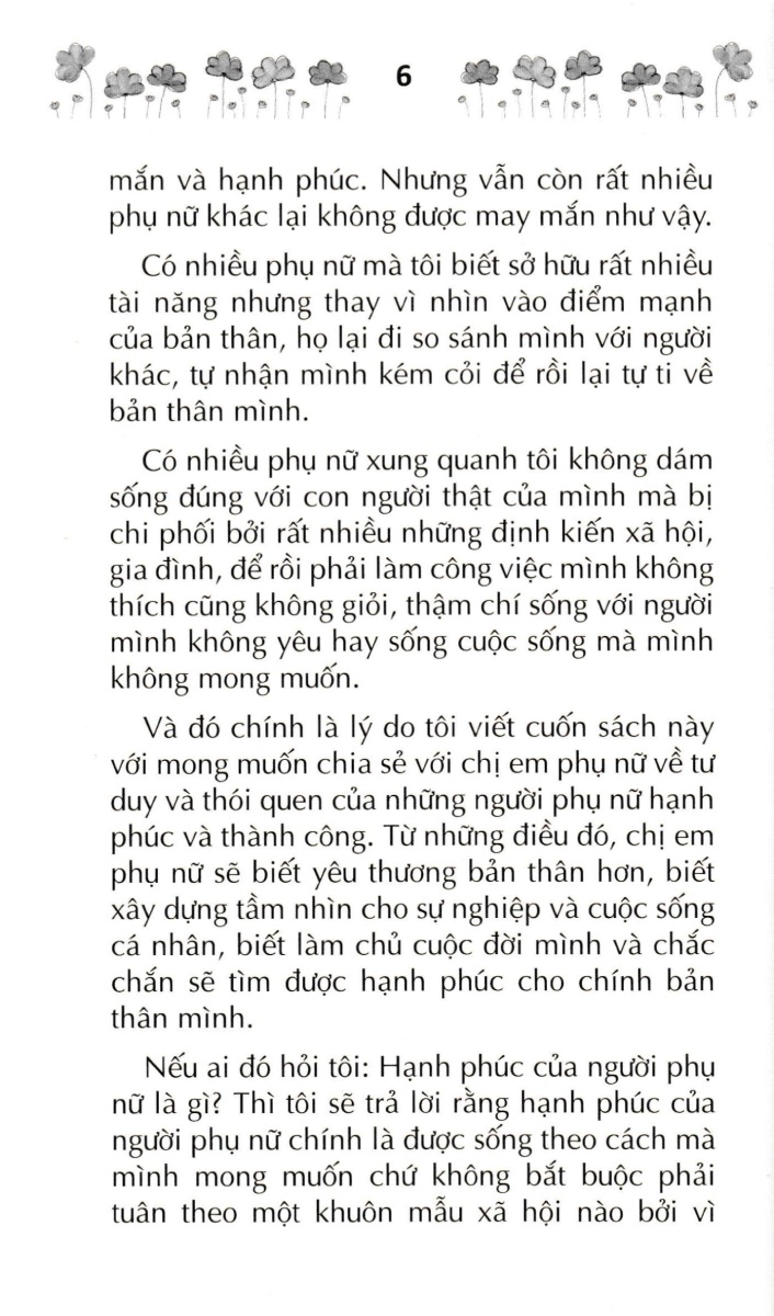 Phẩm Cách Cao Quý - Bản Lĩnh Nữ Hoàng - 30 Nguyên Tắc Vàng Của Phụ Nữ Hạnh Phúc (Sbooks) "Not all of us can do great things. But we can do small things with great love." Không phải tất cả chúng ta đều có thể làm được những điều lớn lao. Nhưng chúng ta có thể làm những việc nhỏ với tình yêu lớn. Đó là câu nói mà tôi rất thích của mẹ Teresa. Nếu ai đó hỏi tôi rằng một trong những khát vọng lớn nhất của tôi hiện tại là gì, thì đó chính là mong muốn giúp cho chị em phụ nữ có một cuộc sống tốt đẹp hơn. Chính điều đó đã thôi thúc tôi dành thời gian và tâm huyết để viết nên quyển sách này.