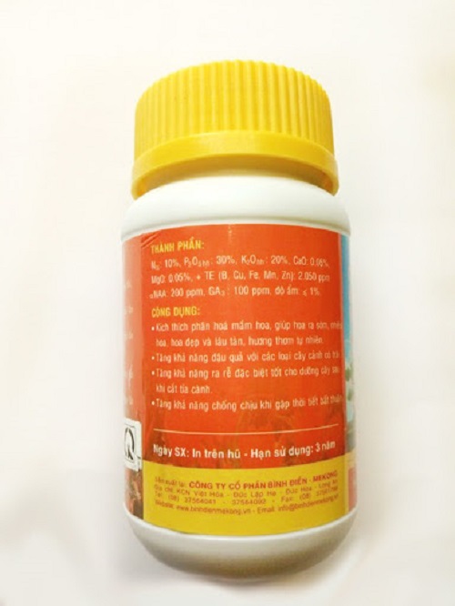• Thành phần: N: 10 %, P2O5: 30 %, K2O: 20 %, CaO: 0.05 %, MgO: 0.05 %, TE (B, Cu, Fe, Mn, Zn): 2050 ppm, NAA: 200 ppm, GA3: 100 ppm.
