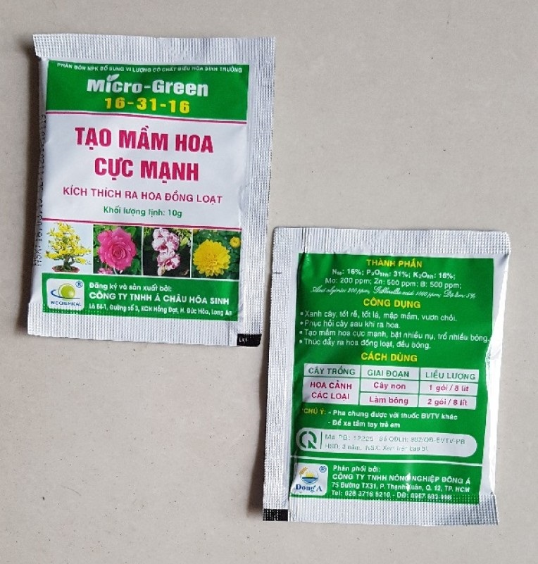 Phân bón Micro Green là dòng phân bón chứa hàm lượng lân (P) cao, chiếm 31%. Phân bón micro green 16 31 16 này được dùng chuyên để tạo mầm, đánh bật mầm ngủ của hoa và kích ra hoa cho cây trồng. Hàm lượng nito và kali chiếm 16% chồi, lá xanh tốt, chồi phát triển nhanh hơn.