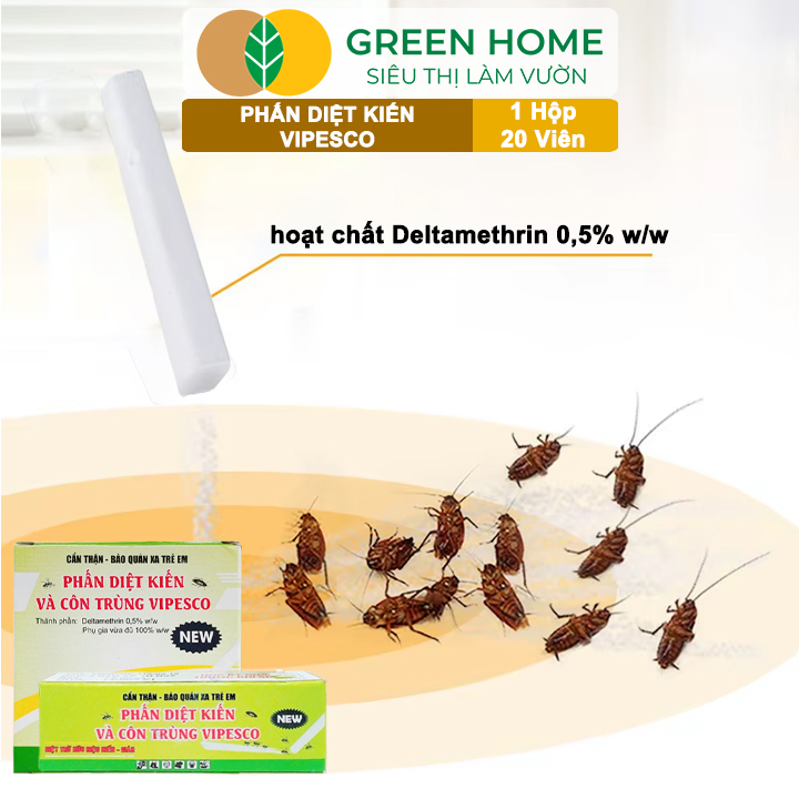 GIÁ SỈ SIÊU LỢI: Giá chỉ còn 6.000đ Số lượng: 200 gói Giá chỉ còn 6.500đ Số lượng: 100 gói ĐẶC ĐIỂM NỔI BẬT - Hiệu quả nhanh: Diệt kiến, gián và nhiều loại côn trùng nhờ hoạt chất Deltamethrin 0.5%. - Diệt tận gốc: Côn trùng mang chất độc về tổ, giúp tiêu diệt cả đàn. - Dễ sử dụng: Dạng viên, chỉ cần vẽ trực tiếp nơi côn trùng hay đi qua. - An toàn: Không mùi, ít ảnh hưởng đến người và vật nuôi nếu dùng đúng cách. Phấn Diệt Kiến Và Côn Trùng Vipesco, GreenHome, Hộp 2 Viên, Diệt Trừ Kiến, Gián, Rận, Rệp, Bọ Chét,. Hiệu quả nhanh: Diệt kiến, gián và nhiều loại côn trùng nhờ hoạt chất Deltamethrin 0.5%. Diệt tận gốc: Côn trùng mang chất độc về tổ, giúp tiêu diệt cả đàn. MÔ TẢ SẢN PHẨM: - Phấn diệt kiến và côn trùng VIPESCO là sản phẩm diệt côn trùng dạng viên, tiện lợi và hiệu quả, chuyên dùng để tiêu diệt kiến, gián và các loại côn trùng nhỏ trong nhà ở, nhà hàng, quán ăn, kho bãi...