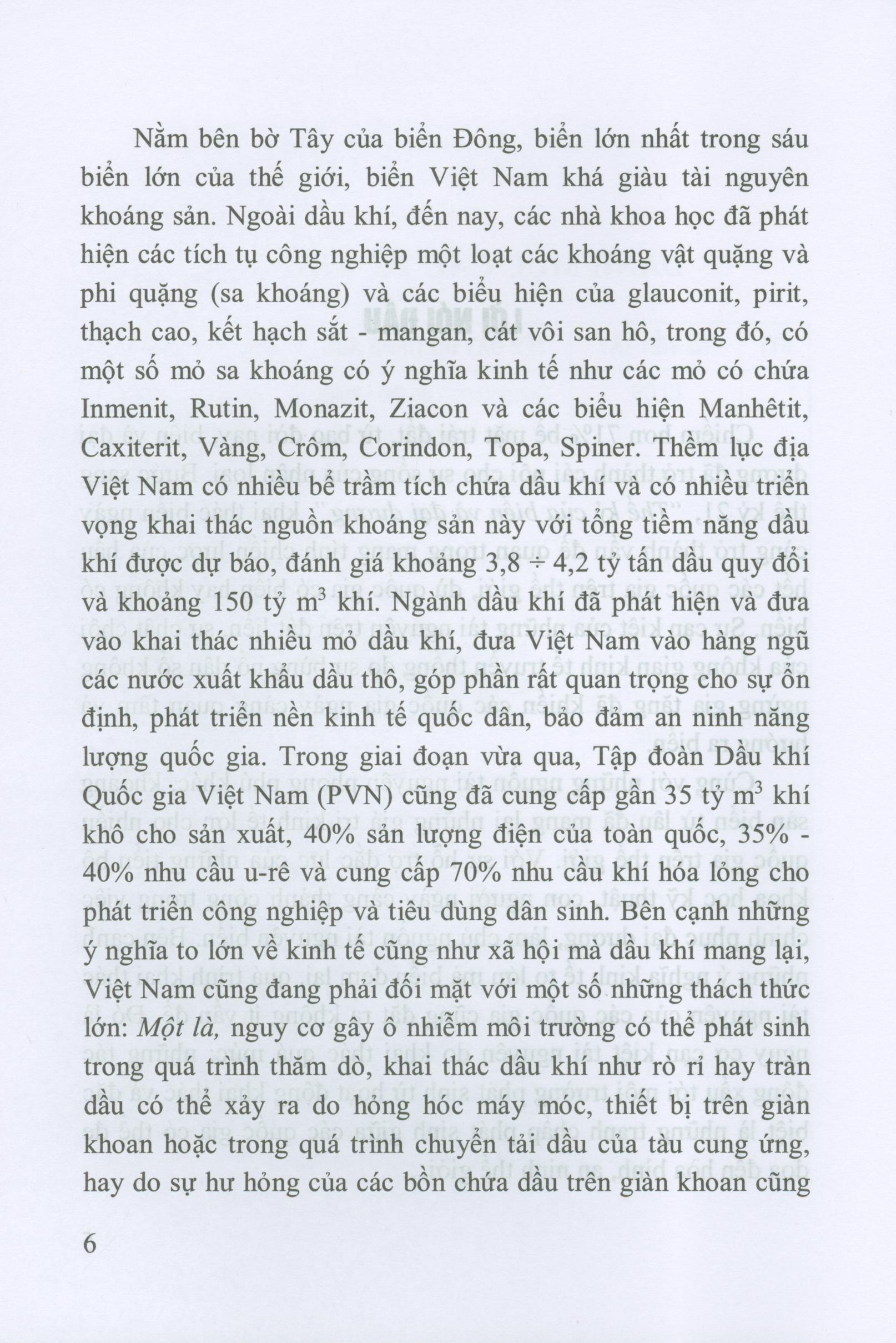 Nằm bên bờ Tây của biển Đông, biển lớn nhất trong sáu biển lớn của thế giới, biển Việt Nam khá giàu tài nguyên khoáng sản. Ngoài dầu khí, đến nay, các nhà khoa học đã phát hiện các tích tụ công nghiệp một loạt các khoáng vật quặng và phi quặng (sa khoáng) và các biểu hiện của glauconit, pirit, thạch cao, kết hạch sắt - mangan, cát vôi san hô, trong đó, có một số mỏ sa khoáng có ý nghĩa kinh tế như các mỏ có chứa Inmenit, Rutm, Monazit, Ziacon và các biểu hiện Manhêtit, Caxiterit, Vàng, Crôm, Corindon, Topa, Spiner. Thềm lục địa Việt Nam có nhiều bể trầm tích chứa dầu khí và có nhiều triển vọng khai thác nguồn khoáng sản này với tổng tiềm năng dầu khí được dự báo, đánh giá khoảng 3,8 - 4,2 tỷ tấn dầu quy đổi và khoảng 150 tỷ m khối khí. Ngành dầu khí đã phát hiện và đưa vào khai thác nhiều mỏ dầu khí, đưa Việt Nam vào hàng ngũ các nước xuất khẩu dầu thô, góp phần rất quan trọng cho sự ổn định, phát triển nền kinh tế quốc dân, bảo đảm an ninh năng lượng quốc gia. Trong giai đoạn vừa qua, Tập đoàn Dầu khí Quốc gia Việt Nam (PVN) cũng đã cung cấp gần 35 tỷ m khí khô cho sản xuất, 40% sản lượng điện của toàn quốc, 35% - 40% nhu cầu u-rê và cung cấp 70% nhu cầu khí hóa lỏng cho phát triển công nghiệp và tiêu dùng dân sinh. Bên cạnh những ý nghĩa to lớn về kinh tế cũng như xã hội mà dầu khí mang lại, Việt Nam cũng đang phải đối mặt với một số những thách thức lớn: Một là, nguy cơ gây ô nhiễm môi trường có thể phát sinh trong quá trình thăm dò, khai thác dầu khí như rò rỉ hay tràn dầu có thể xảy ra do hỏng hóc máy móc, thiết bị trên giàn khoan hoặc trong quá trình chuyển tải dầu của tàu cung ứng, hay do sự hư hỏng của các bồn chứa dầu trên giàn khoan cũng như tàu dịch vụ; sự biến đổi của môi trưòng sinh thái biển do các hóa chất được sử dụng, chất thải thải ra trong quá trình thăm dò, khai thá; hai là, nguy cơ cạn kiệt tài nguyên trong tương lai khi hầu hết các mỏ dầu ở Việt Nam đều đã khai thác trong thời gian dài và hiện đang trong giai đoạn cuối dẫn tới suy giảm sản lượng tự nhiên, mỏ Bạch Hổ cung cấp sản lượng lớn nhất, chiếm hơn 60% sản lượng của Tổng công ty dầu khí Việt Nam từ trước đến nay, đã vào giai đoạn suy kiệt; ba là, sự phức tạp trong các tranh chấp tại biển Đông ngày càng gia tăng cả về số lượng và mức độ nghiêm trọng, đe dọa nghiêm trọng an ninh, lợi ích quốc gia trên biển.