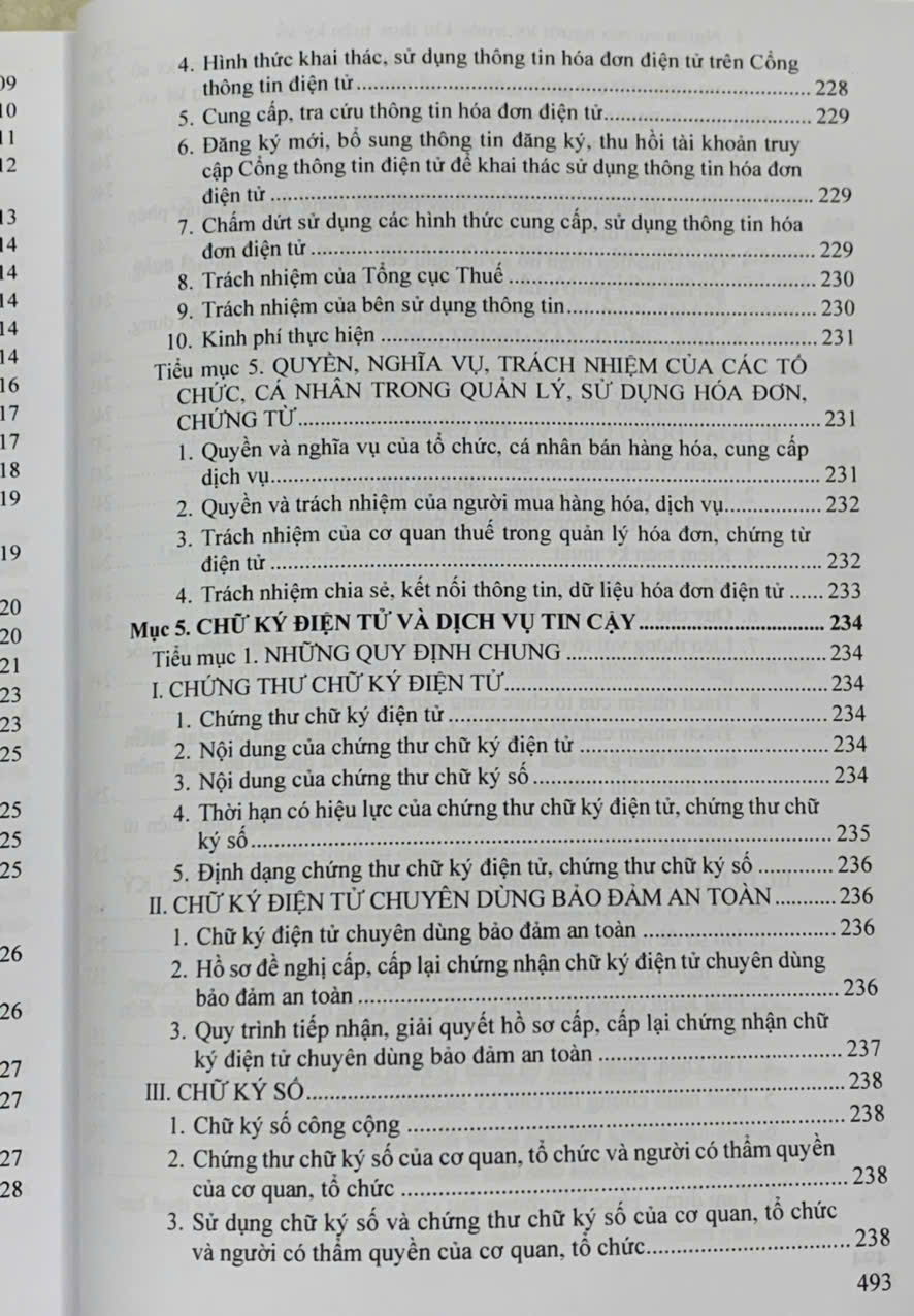 Phần thứ hai. HOẠT ĐỘNG DOANH NGHIỆP (Bao gồm 13 mục như sau: Mục 1. Thuế thu nhập doanh nghiệp; Mục 2. Thuế giá trị gia tang; Mục 3. Thuế thu nhập cá nhân; Mục 4. Hóa đơn, chứng từ; Mục 5. Chữ ký điện tử và dịch vụ tin cậy; Mục 6. Trích lập và xử lý các khoản dự phòng giảm giá hàng tồn kho, tổn thất các khoản đầu tư, nợ phải thu khó đòi và bảo hành sản phẩm, hàng hóa, dịch vụ, công trình xây dựng tại doanh nghiệp; Mục 7. Các loại thuế, phí, lệ phí khác; Mục 8. Bảo hiểm xã hội; Mục 9. Xây dựng và thông báo thang lương, bảng lương, phụ cấp lương; Mục 10. Thay đổi nội dung đăng ký doanh nghiệp; Mục 11. Quản trị - điều hành; Mục 12. Tài sản doanh nghiệp; Mục 13. Phòng cháy và chữa cháy
