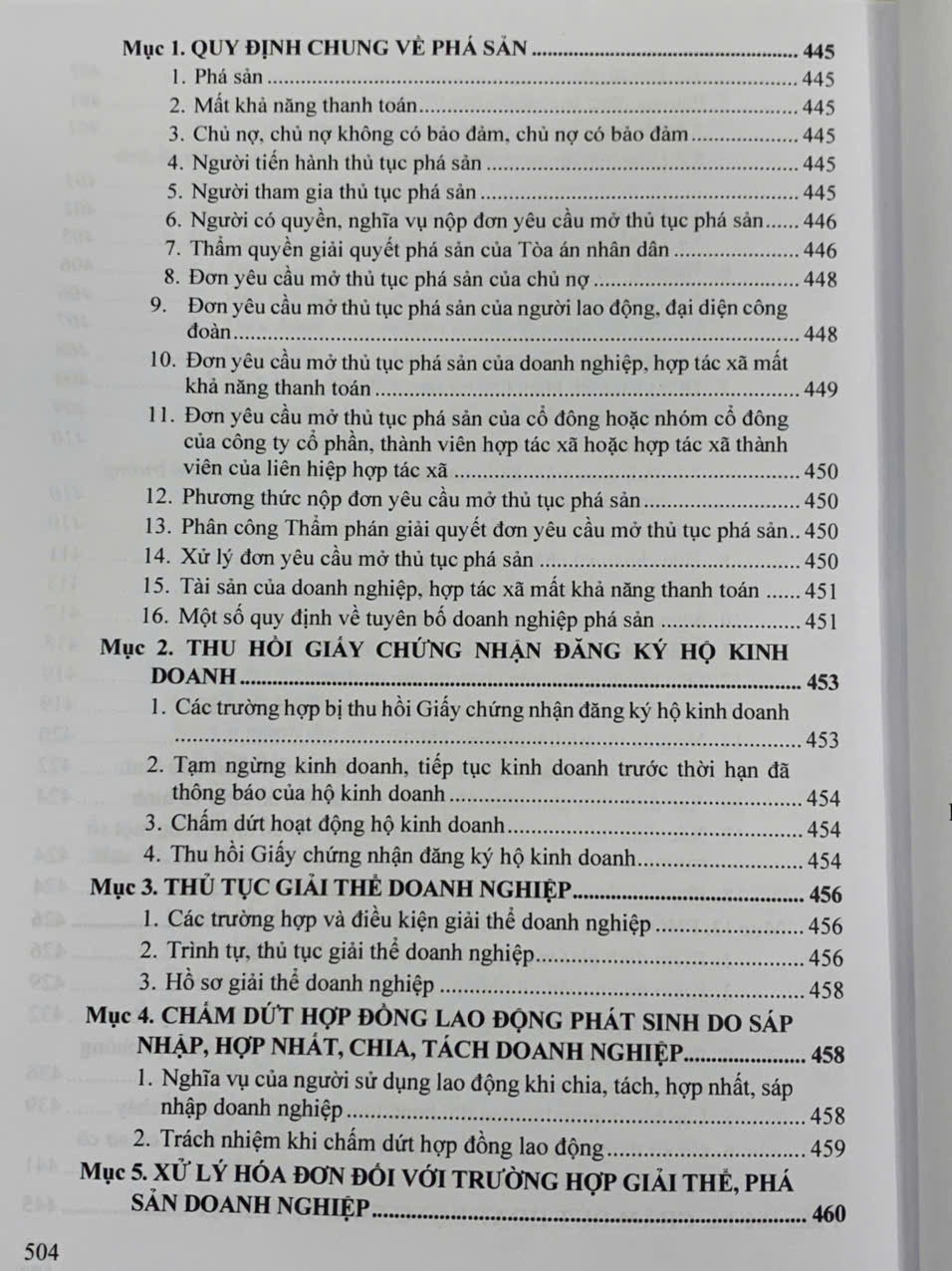 Phần thứ ba. CHẤM DỨT HOẠT ĐỘNG DOANH NGHIỆP (Bao gồm 7 mục như sau: Mục 1. Quy định chung về phá sản; Mục 2. Thu hồi giấy chứng nhận đăng ký hộ kinh doanh; Mục 3. thủ tục giải thể doanh nghiệp; Mục 4. Chấm dứt hợp đồng lao động phát sinh do sáp nhập, hợp nhất, chia, tách doanh nghiệp; Mục 5. Xử lý hóa đơn đối với trường hợp giải thể, phá sản doanh nghiệp; Mục 6. Chấm dứt hoạt động chi nhánh, văn phòng đại diện, địa điểm kinh doanh; Mục 7. Chấm dứt hoạt động hộ kinh doanh