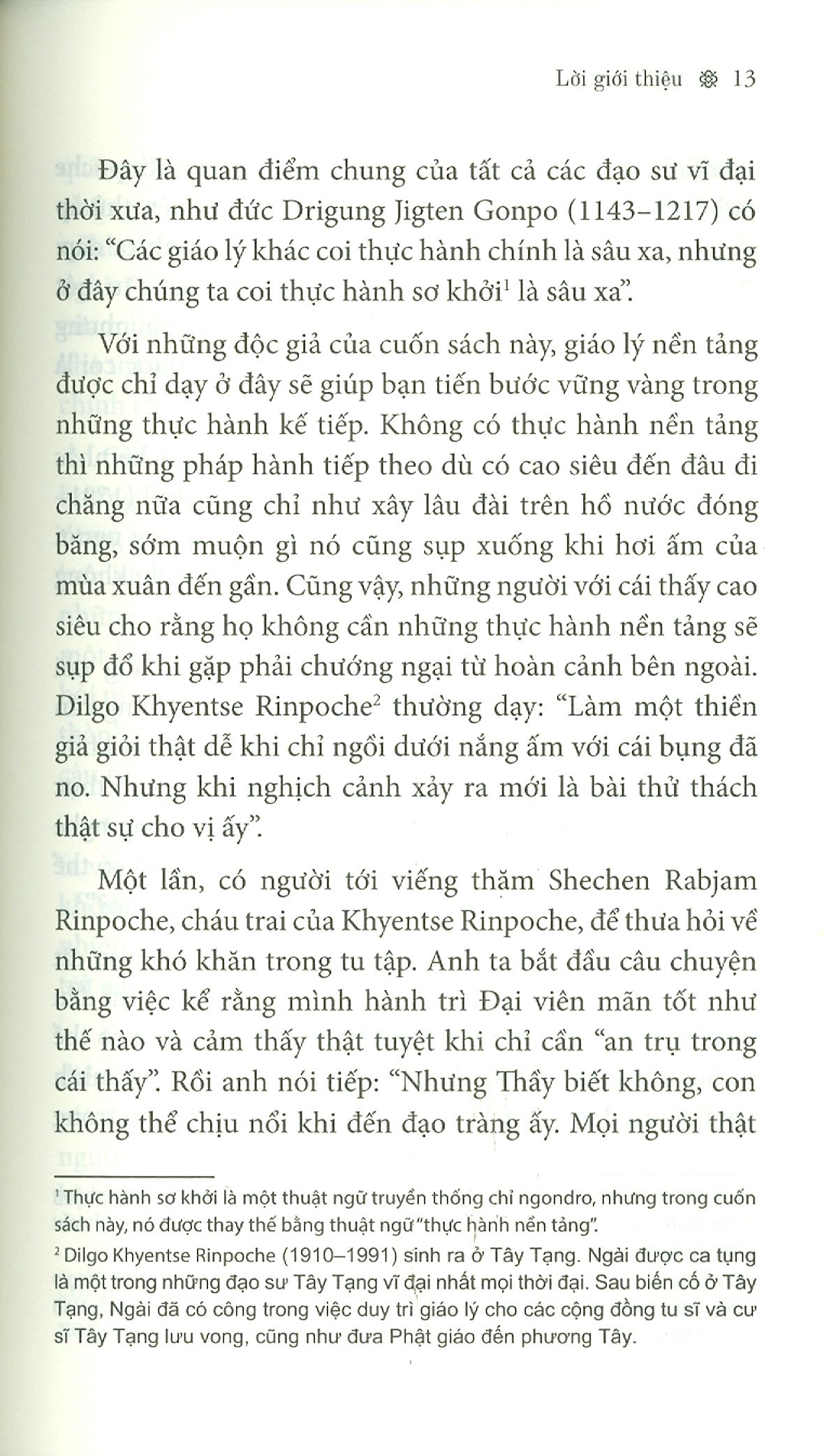 Tôi nói với cô ấy: “Bất cứ ai thực hành pháp cũng đều phải vượt qua những khó khăn của riêng m.ình. Nếu không thì thực hành để làm gì? Và ai cũng cần được khích lệ. Tất cả chư bồ-tát – những người phát nguyện giải thoát hết thảy chúng sinh – và các bậc đạo sư, ai cũng phải đối diện với chướng ngại, sự nản lòng hoặc gặp vấn đề với gia đình. Hãy nghĩ về đức Phật Thích Ca, đức Naropa hay đức Milarepa. Các Ngài vĩ đại không phải vì không có chướng ngại, mà vì các Ngài đã tận dụng chính những chướng ngại đó để đánh thức vị phật trong chính m.ình. Hãy nhìn tấm gương của các bậc đạo sư thời nay. Hãy nhìn Khyentse Rinpoche”.