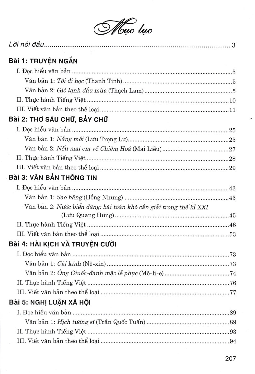NỘI DUNG SÁCH Bài 1: Thơ và thơ song thất lục bát Bài 2: Truyện thơ nôm Bài 3: Văn bản thông tin Bài 4: Truyện ngắn Bài 5: Nghị luận xã hội Bài 6: