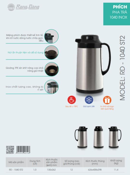Phích Pha trà 1045 1 Lít Model: RD 1045 TS.E Dung tích: 1 lít Vật liệu: thân sắt, vai nhựa Rót nước: dạng nút ấn Nhiệt độ sau 6h: ≥80 ˚C Gioăng: Silicon Thuận tiện