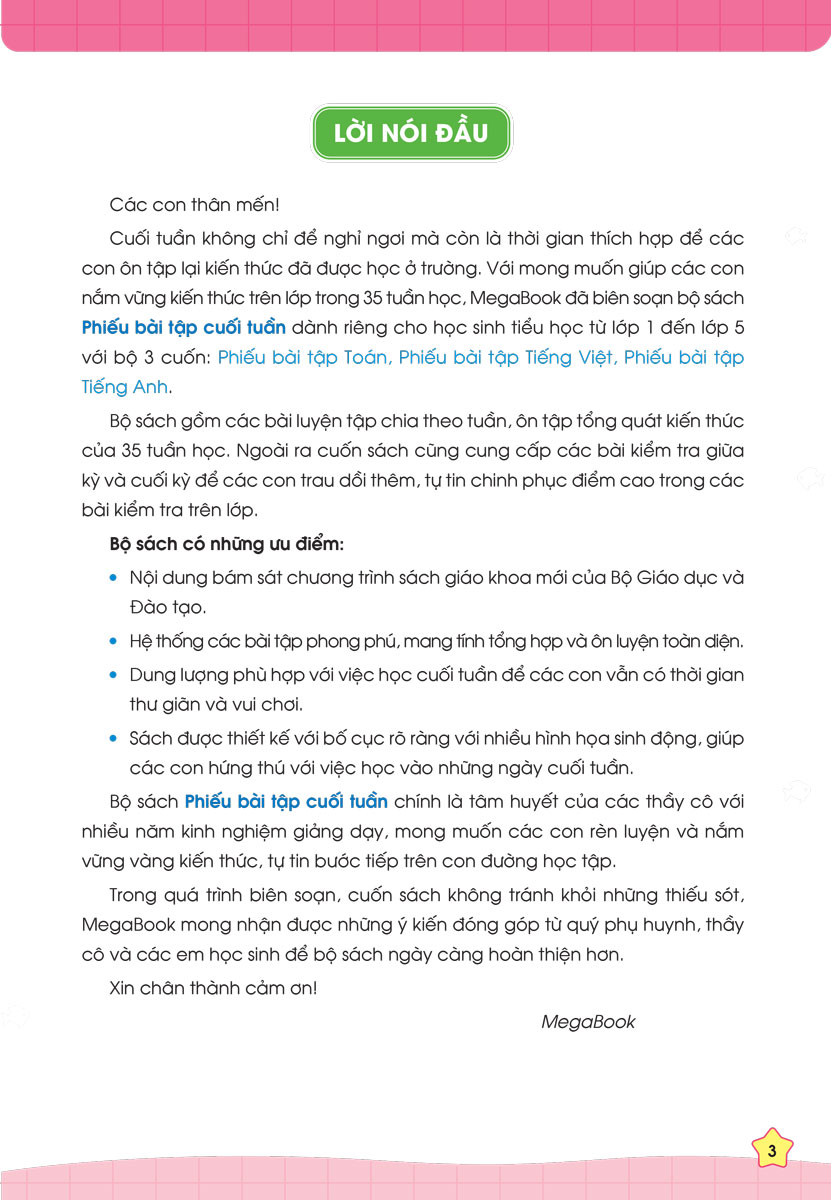 Cuối tuần không chỉ để nghỉ ngơi mà còn là thời gian thích hợp ôn tập lại kiến thức đã được học ở trường. Với mong muốn giúp các con nắm vững kiến thức trên lớp trong 35 tuần học, bộ sách Phiếu bài tập cuối tuần đã được biên soạn dành riêng cho học sinh tiểu học từ lớp 1 đến lớp 5 với bộ 3 cuốn: Phiếu bài tập cuối tuần Tiếng Việt, Phiếu bài tập cuối tuần Toán, Phiếu bài tập cuối tuần Tiếng Anh.