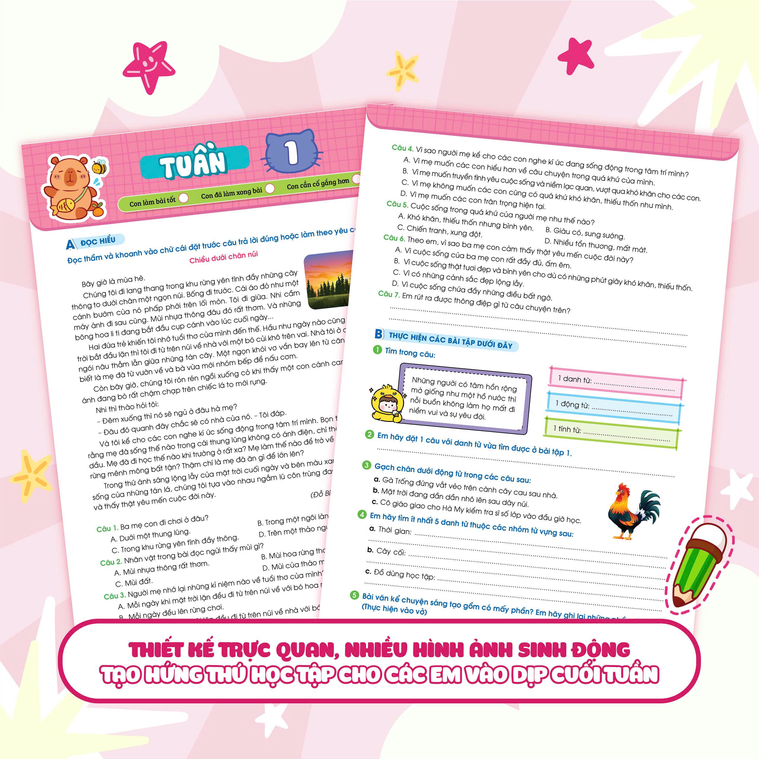 Bộ sách gồm các bài luyện tập chia theo tuần, ôn tập tổng quát kiến thức của 35 tuần học. Ngoài ra, cuốn sách cũng cung cấp các bài kiểm tra giữa kỳ và cuối kỳ để các con trau dồi thêm, tự tin chinh phục điểm cao trong các bài kiểm tra trên lớp.
