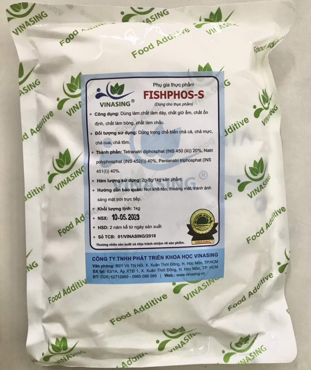 Mua tại TiktokFISPHOS- S - Phụ gia cho chả cá, chả hải sản giòn dai cao cấp Công dụng: Dùng làm chất tạo phức kim loại, chất điều chỉnh độ acid, chất nhũ hóa, chất giữ ẩm, chất tạo xốp, chất ổn định, chất làm dày. Thành phần: Natripolyphosphat (INS452(i))(40%) Pentanatriphosphat (ÍN 451(i))(40%), Tetranatri diphosphat (INS 450(iii))(20%). Đối tượng sử dụng: 09.2.3.Sản phẩm thủy sản sốt cream và xay nhỏ đông lạnh, kể cả nhuyễn thể, giáp xác, da gai: Chả cá, chả mực, chả cua, chả tôm. Liều lượng sử dụng: 2g-5g/1kg sản phẩm. Khối lượng: 1Kg. HSD: 02 năm kể từ ngày sản xuất. Số công bố: 01/VINASING/2018. Hướng dẫn bảo quản: Nơi khô ráo, thoáng mát, tránh ánh sáng mặt trời.
