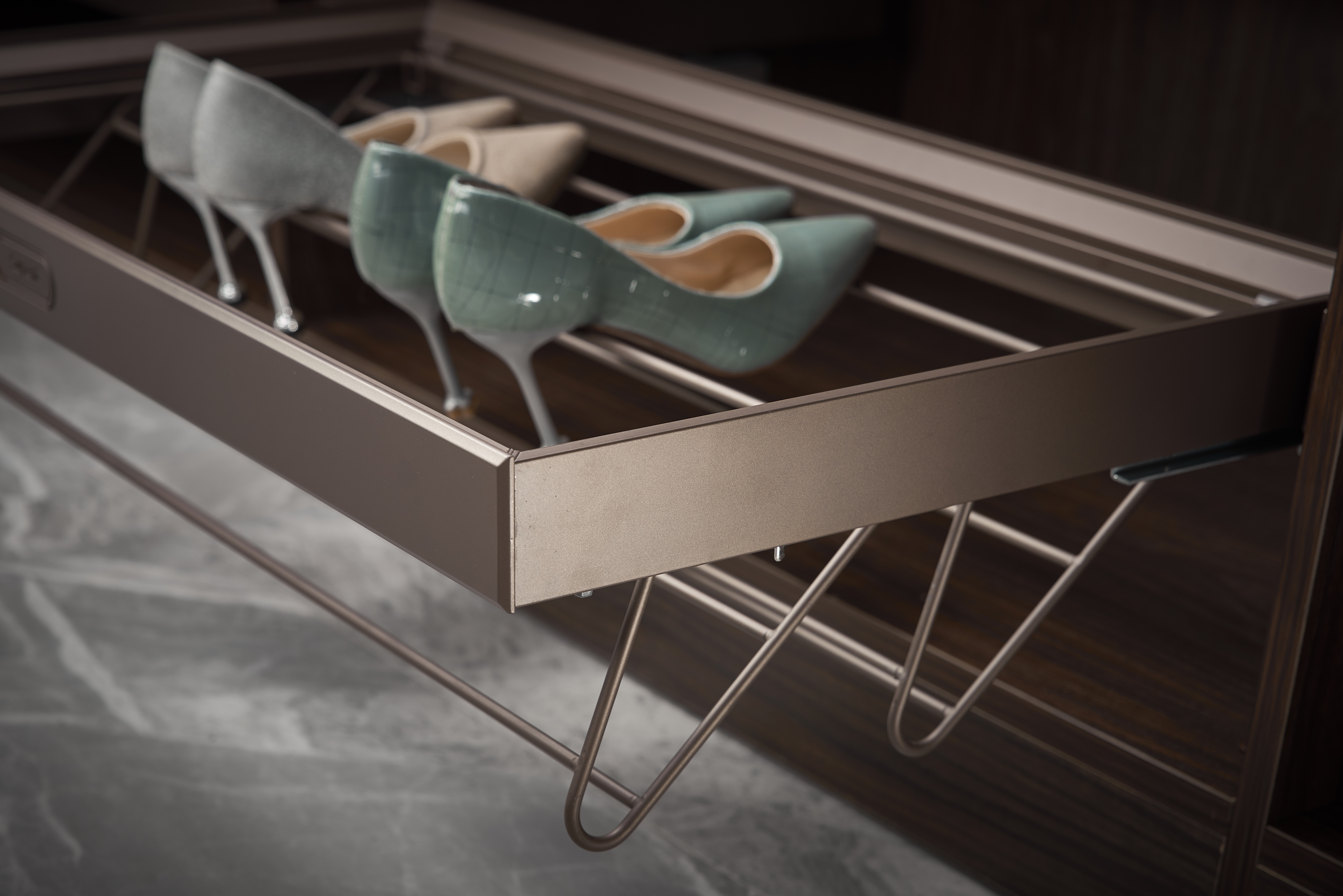 Kệ để giày âm tủ áo ray trượt giảm chấn Gerari là kệ để giày được trang bị âm tủ quần áo với hệ ray trượt giảm chấn đóng mở mang đến sự tiện lợi trong việc cất giữ giày dép nằm gọn trong tủ quần áo. Khung để giày là thiết bị được chế tác bằng hợp kim nhôm carbon dày và chắc chắn trong khi giá để giày là thép không gỉ có thể tháo rời dễ dàng.
