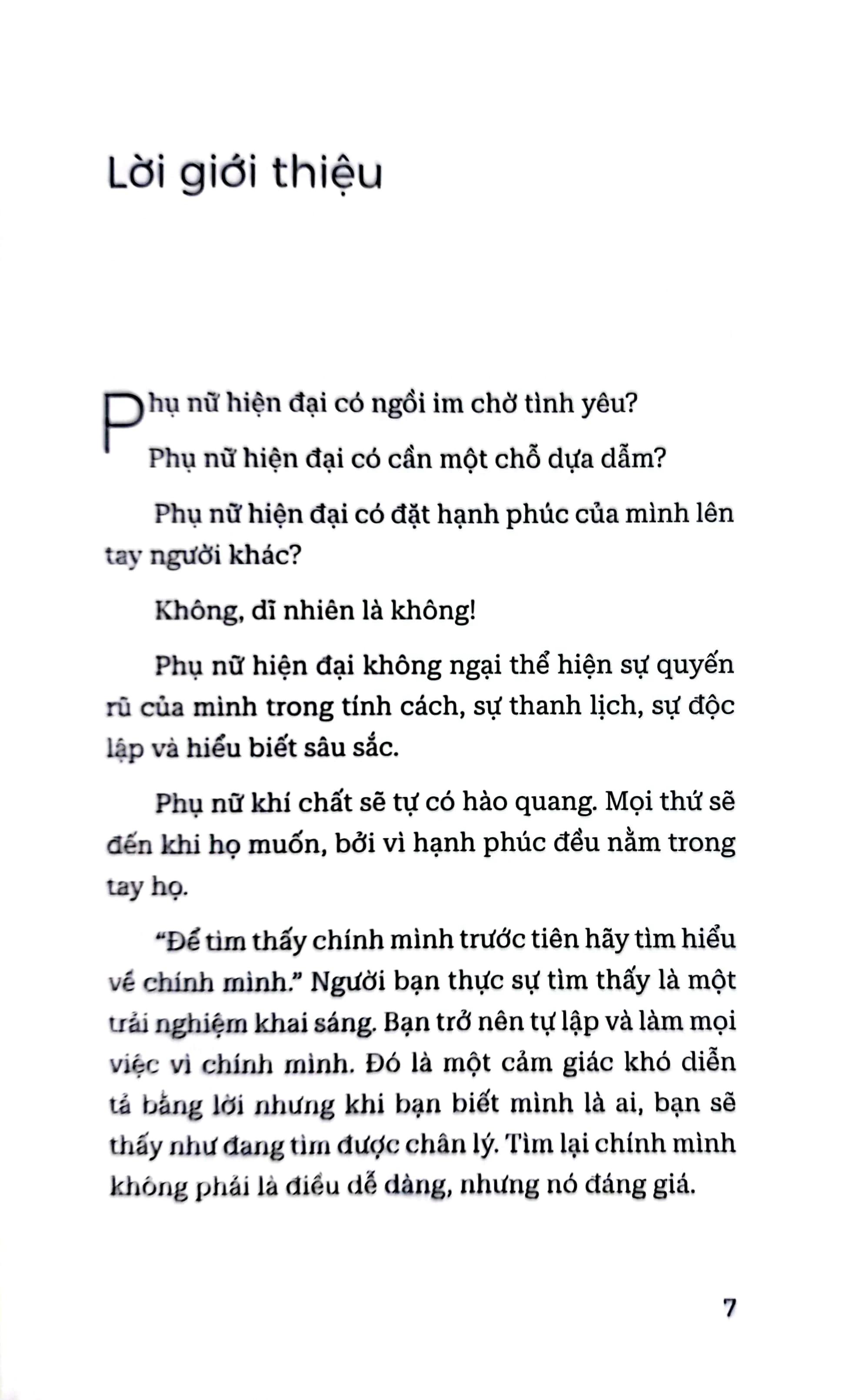Phụ Nữ Khí Chất Sẽ Tự Có Hào Quang (Sbooks) GIỚI THIỆU SÁCH: Phụ nữ hiện đại có ngồi im chờ tình yêu? Phụ nữ hiện đại có cần một chỗ dựa dẫm? Phụ nữ hiện đại có đặt hạnh phúc của mình lên tay người khác? Không, dĩ nhiên là không! Phụ nữ hiện đại không ngại thể hiện sự quyến rũ của mình trong tính cách, sự thanh lịch, sự độc lập và hiểu biết sâu sắc. Phụ nữ khí chất sẽ tự có hào quang. Mọi thứ sẽ đến khi họ muốn, bởi vì hạnh phúc đều nằm trong tay họ. "Để tìm thấy chính mình trước tiên hãy tìm hiểu về chính mình." Người bạn thực sự tìm thấy là một trải nghiệm khai sáng. Bạn trở nên tự lập và làm mọi việc vì chính bản thân mình. Đó là một cảm giác khó diễn tả bằng lời nhưng khi bạn chưa biết mình là ai thì thật khó để bỏ qua. Tìm lại chính mình không phải là điều dễ dàng, nhưng nó đáng giá. Còn nếu bạn chưa biết vẻ đẹp của chính mình, hãy đọc cuốn sách này. Với những bài viết được chắt lọc từ kinh nghiệm cá nhân, và tham khảo nhiều tài liệu hữu ích, tác giả đã đưa ra các luận điểm giúp cho các bạn nữ dễ dàng hơn trên hành trình tỏa sáng, tự nắm lấy khí chất của bản thân, và đạt được hào quang đời mình. Phụ nữ, bạn sẵn sàng chưa?