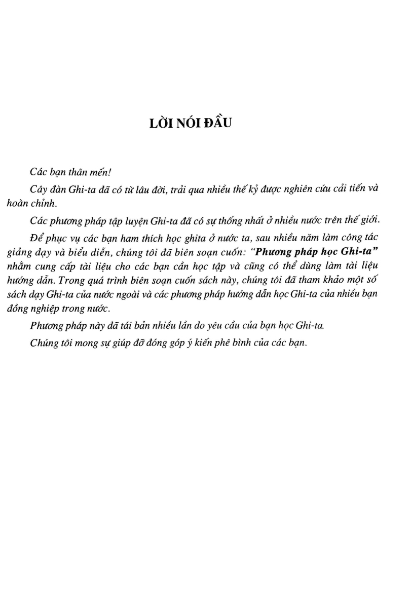 Để phục vụ các bạn ham thích học Ghi-ta ở nước ta, sau nhiều năm làm công tác giảng dạy và biểu diễn, chúng tôi đã biên soạn cuốn: “Phương pháp học Ghi-ta” nhằm cung cấp tài liệu cho các bạn cần học tập và cũng có thể dùng làm tài liệu hướng dẫn. Trong quá trình biên soạn cuốn sách này, chúng tôi đã tham khảo một số sách dạy Ghi-ta của nước ngoài và các phương pháp hướng dẫn học Ghi-ta của nhiều bạn đồng nghiệp trong nước.