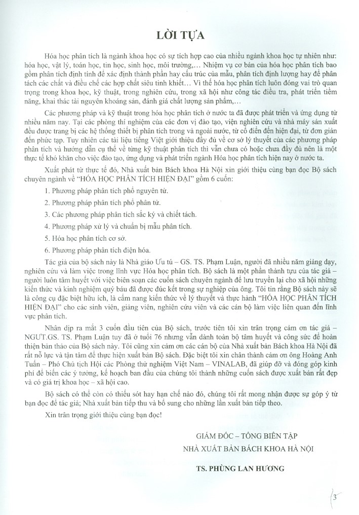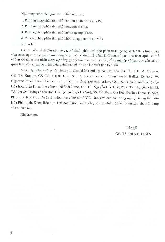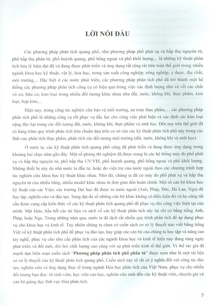 Ở nước ta, các kỹ thuật phân tích quang phổ cũng đã phát triển và đang được ứng dụng trong khoảng hai chục năm gần đây. Tuy nhiên chúng ta chưa có cuốn sách cơ sở lý thuyết nào viết bằng tiếng Việt về kỹ thuật phân tích phổ để phục vụ đào tạo, hay giúp các cán bộ của chúng ta học tập và nâng cao tay nghề. Vì thế tác giả đã mạnh dạn biên soạn cuốn sách “Phương pháp phân tích phổ phân tử” được xem như là một tài liệu cơ sở lý thuyết của kỹ thuật phân tích quang phổ. Cuốn sách này sẽ rất có ý nghĩa đối với công tác đào tạo, nghiên cứu và ứng dụng thực tế trong ngành Hóa học phân tích của Việt Nam, phục vụ cho nhiều đối tượng bạn đọc: từ sinh viên, học viên cao học, nghiên cứu sinh đến các kỹ thuật viên, chuyên gia và cán bộ giảng dạy lĩnh vực Hóa phân tích.