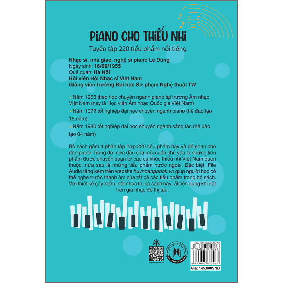 Cùng với những nghệ sĩ tên tuổi như: Đặng Thái Sơn, Đỗ Hồng Quân, Đặng Hữu Phú Lê Dũng là một trong những lớp nghệ sĩ đầu tiên theo học đàn Piano một cách chuyên nghiệp và bài bản. Với nhiều năm kinh nghiệm biểu diễn, sáng tác và giảng dạy, nhạc sĩ, nhà giáo, nghệ sĩ piano Lê Dũng đã biên soạn khá nhiều đầu sách tham khảo dành cho những người thực hành chơi đàn Piano. Cuốn Piano Cho Thiếu Nhi - Tuyển Tập 220 Tiểu Phẩm Nổi Tiếng gồm 4 tập, chọn lọc những tiểu phẩm hay, nổi tiếng soạn riêng cho đàn piano giúp những bạn yêu thích âm nhạc, đặc biệt là các em thiếu nhi luyện tập. Đặc biệt với 220 tiểu phẩm này, các em cũng có thể luyện tập trên đàn Organ.