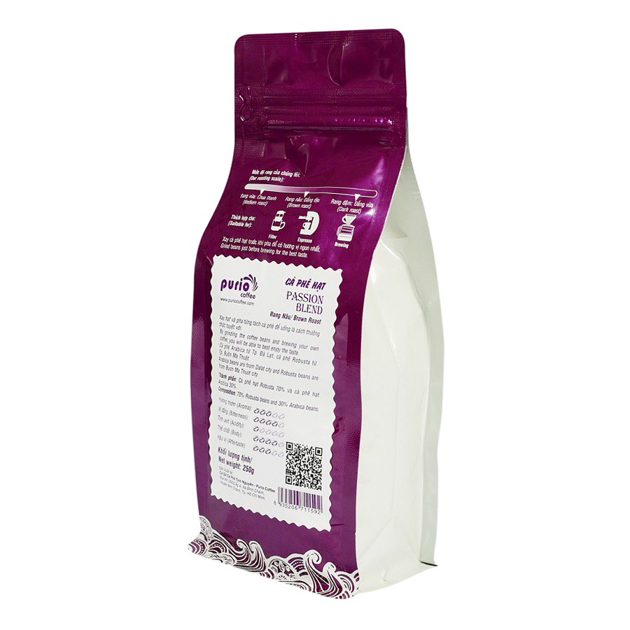 Purio Coffee trân trọng giới thiệu Passion Blend với 7A & 3R, hậu vị mượt mà với vị đắng và vị chua nhẹ. Với Passion Blend, chúng tôi tự hào rằng, cà phê Việt Nam không hề thua kém so với các dòng sản phẩm cà phê ngon nổi tiếng trên thế giới.