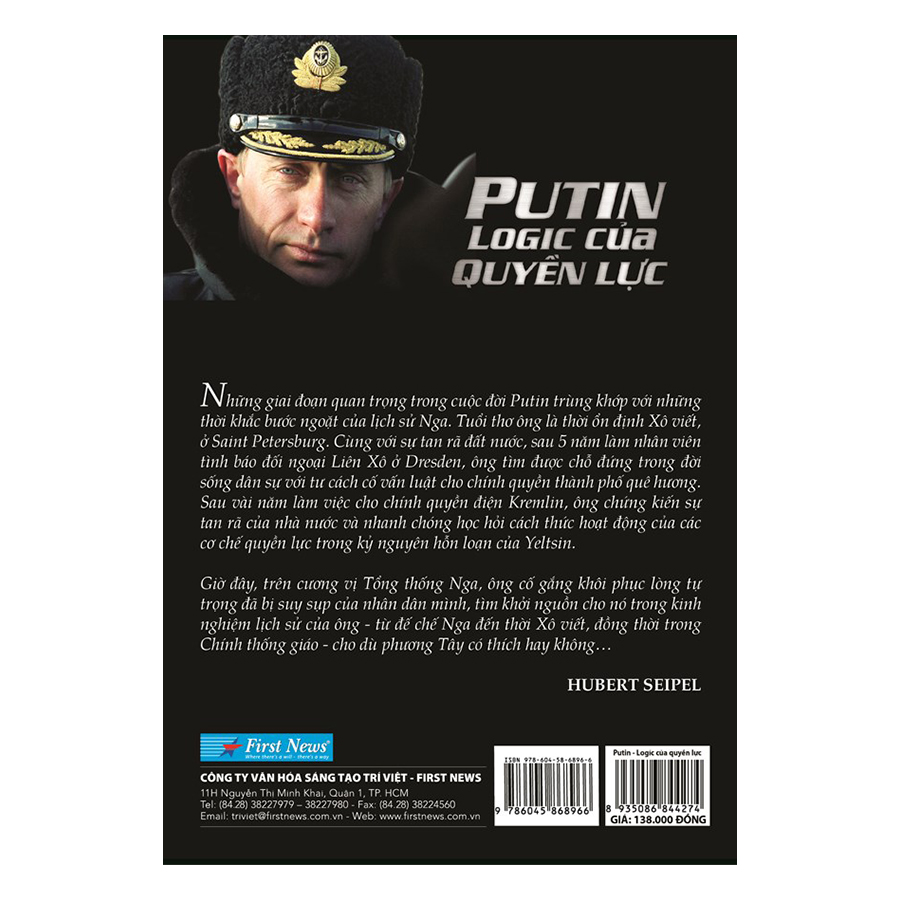 Từ một nhân viên tình báo đối ngoại làm thế nào để Putin trở thành Tổng thống Nga, người đàn ông quyền lực nhất thế giới? Và, con người thực của ông là thế nào? Hubert Seipel – một nhà báo, nhà làm phim lão làng của Đức, đã mang đến một câu trả lời đầy hấp dẫn trong cuốn sách Putin – Logic của quyền lực. Hơn một năm đầu tư nghiêm túc cho bản thảo, First News – Trí Việt mới có thể đưa đến bạn đọc quyển sách đặc biệt này.