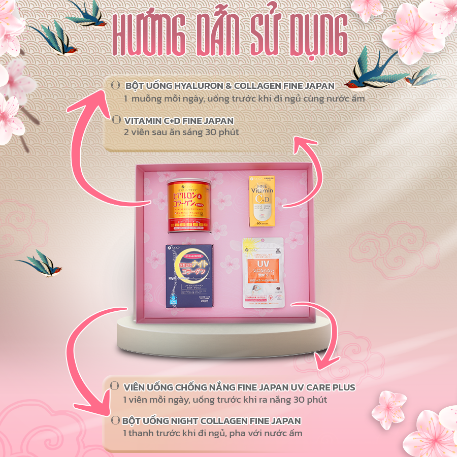 Combo SAKURA TẾT ĐONG ĐẦY: 1. Bột uống Hyaluron & Collagen Fine Japan hạn chế lão hóa da, giúp mịn và trắng da 196g 2. Vitamin C+D Fine Japan Ngăn Ngừa Suy Nhược Cơ Thể