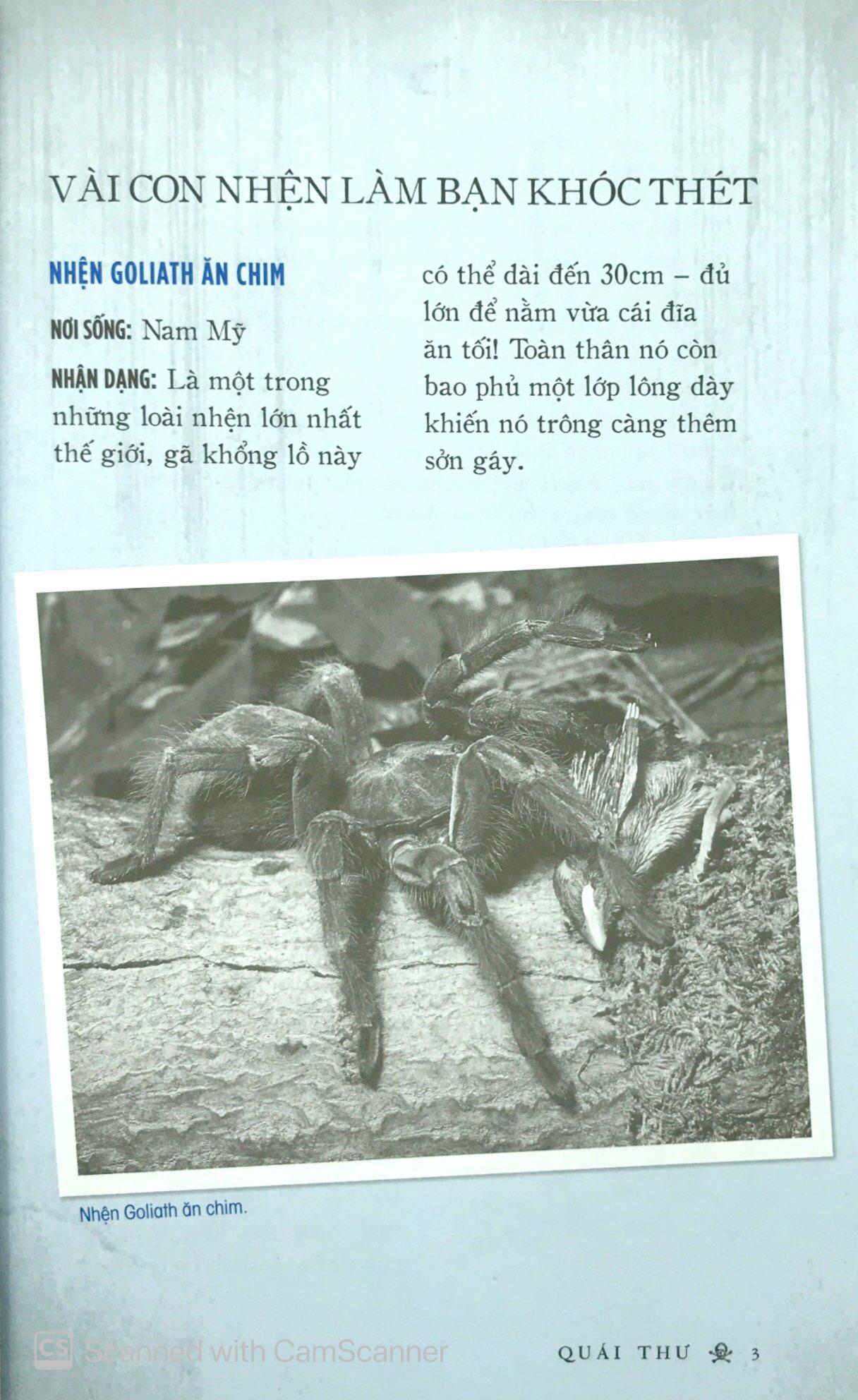 Mua tại TiktokCuốn bách khoa về những thứ con người sợ hãi, từ nhện cho đến ma quỷ, phù thủy, người sói. cầu cơ, xác sống... Nêu rõ nguồn gốc, nguyên nhân lẫn xuất xứ và thêm vào những thông tin cho thấy thực tế chúng không quá đáng sợ, chỉ là con người bị sợ hãi theo đám đông, hay theo một hội chứng khoa học nào đó. Với thông tin không thể chi tiết hơn nữa, hình minh họa đủ dọa khối người và giọng điệu hài hước cùng những trò lừa dọa dẫm cho người đọc áp dụng trong dịp Halloween, Quái thư là một thử thách thú vị cho những bạn đọc thích thể loại bí ẩn, sinh vật huyền bí và khối thứ liên quan đến ma quái.