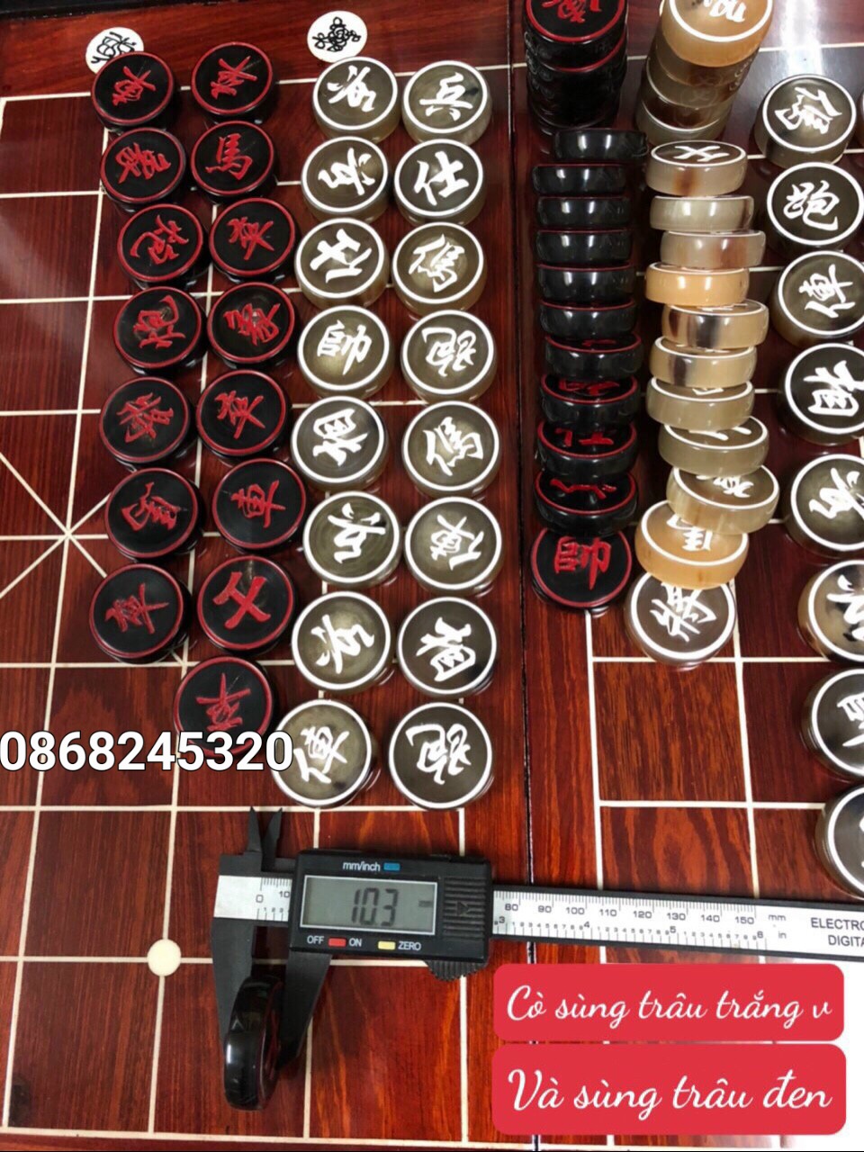 _ Bộ quân cờ tướng được làm bằng chất liệu sừng trắng, sừng đen tự nhiên 100% _ Kt mặt sừng tròn 3.7×1.2cm _ Quân cờ được chạm khắc tỉ mỉ ,tinh xảo kỳ công