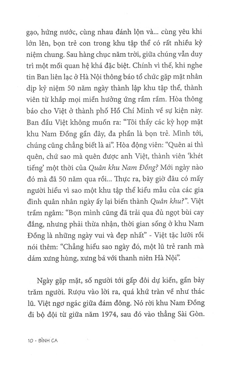 Đọc Quân khu Nam Đồng, người ta không còn nghĩ tới ranh giới của bên thua và bên thắng cuộc, không còn nghĩ về chiến tranh một cách tự hào hay thù hằn. Tôi rất nhớ những lời đạo diễn Trần Văn Thuỷ đã viết trong “Chuyện nghề của Thuỷ”, đại ý rằng, những ai đã thực sự đi qua chiến tranh, sẽ không thể kể về nó một cách hào hùng được. Vì chiến tranh chỉ có đau thương và mất mát. Đó thực sự là điều tôi thấm thía và cảm nhận được trong Quân khu Nam Đồng –với từng con chữ được viết bằng cả trái tim và phần tâm hồn (mà tôi tin là) đẹp nhất của tác giả Bình Ca.