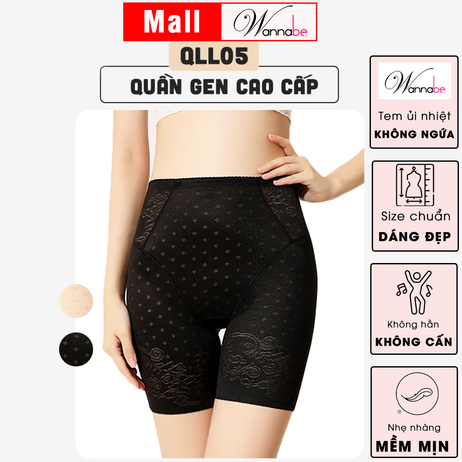 Quần lót gen nữ cao cấp QLL05 giúp định hình vòng bụng tái tạo đường cong tạo sự tự tin quyến rũ  Quần lót gen nữ cao cấp Wannabe QLL05 dáng quần boxer cạp cao chống cuộn. Thiết kế cắt ráp 3 chiều giúp che khuyết điểm mỡ thừa vùng bụng vùng eo tạo vùng eo thon gọn vùng bụng phẳng lì cùng với kiểu thiết kế cắt ráp 3 chiều này hỗ trợ nâng đẩy vòng 3 tạo sự đầy đặn quyên rũ làm bật lên các đường cong cơ thể  giúp em chị em tự tin khi diện các trang phục bó sát mà không mang đến cảm sát gò bó khó chịu Chất liệu: quần gen chất su ren lưới co giãn nhẹ nhàng  mềm mịn thấm hút êm dịu với mọi làn da Kiểu dáng: quần gen dạng quần đùi, lưng cao Đáy quần gen mặt trong lót 100% cotton thấm hút mang đến sự tươi mát suốt cả ngày dài Ưu điểm: quần gen hỗ trợ che khuyết điểm mỡ thừa và giúp nâng đẩy vòng 3, thoải mái dễ chịu khi mặc Phù họp: quần gen mặc lót bên trong khi mặc đầm công sở, đầm dạ hội, dự tiệc,... Màu sắc: Da, Đen Size: M(vòng 3 80~95cm) ,L (95~110cm)   SẢN PHẨM LÊN Ý TƯỞNG VÀ THIẾT KẾ BỞI: Công ty TNHH SXTMDV Nữ Hoàng Thời Trang   WANNABE CAM KẾT: