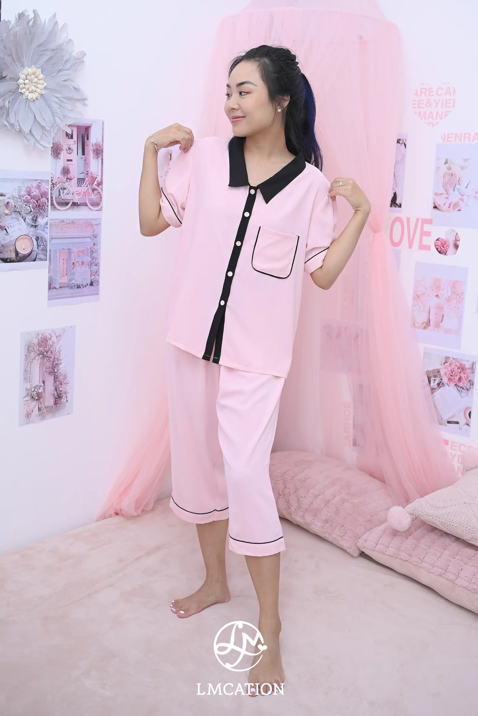 Quần lửng mặc nhà LMcation Alia mềm mại, sang trọng, được may từ chất liệu lụa cao cấp. Quần dài qua đầu gối, có túi hai bên tiện lợi và đính nơ xinh xắn, hoàn
