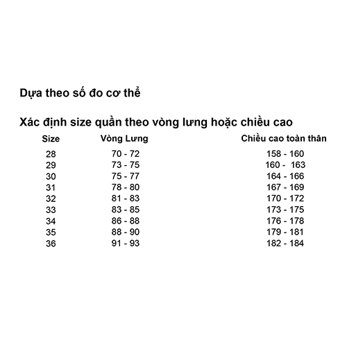 Dimentions Size Lưng (cm) Dài (cm) Mông (cm) Ống (cm) M 70 44 88 48 L 76 46 92 50 XL 80 55 100 56 · Số đo có sai số +/-2cm