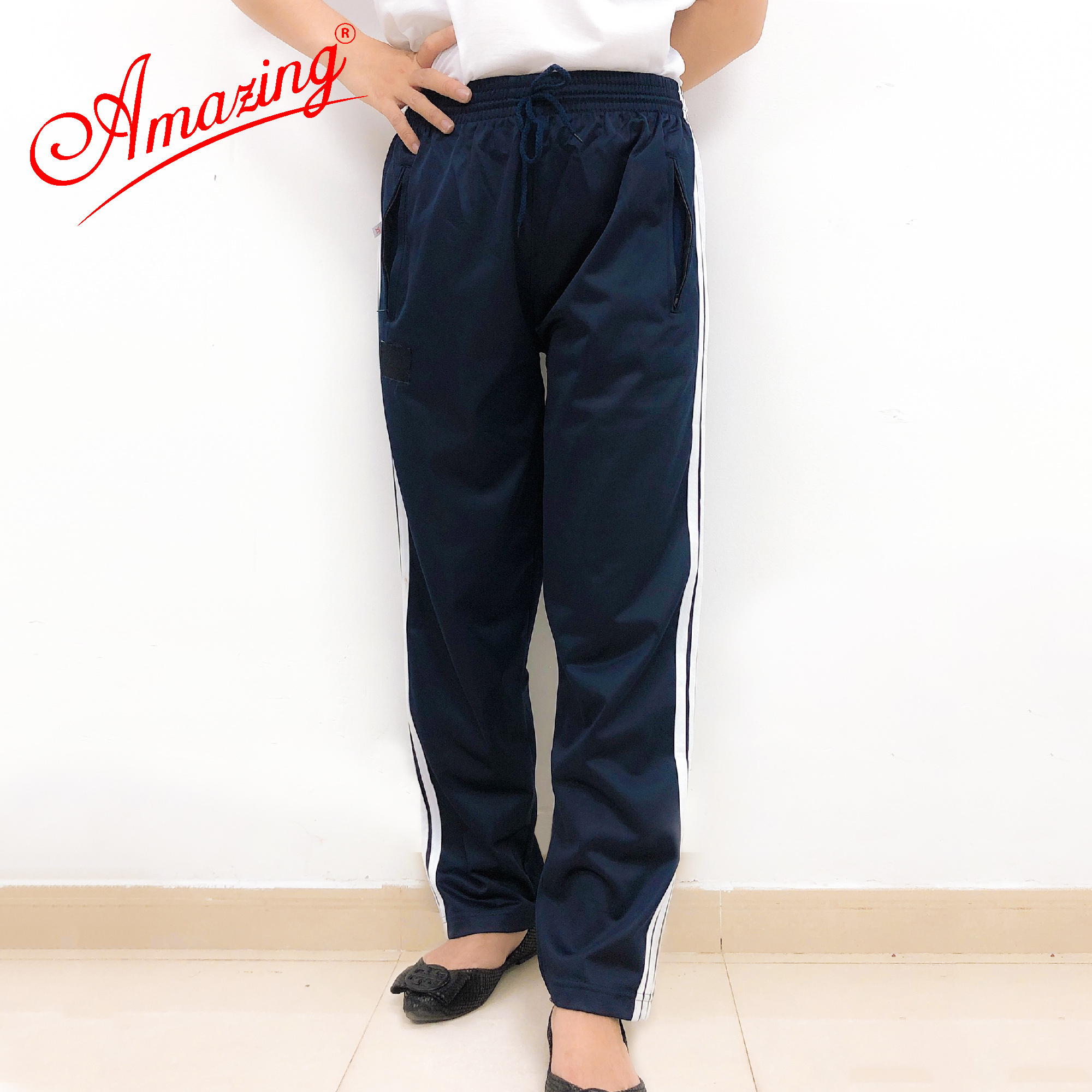 - Quần thể dục 3 sọc, lưng thun, dây rút, vải thun cào, hút mồ hôi tốt