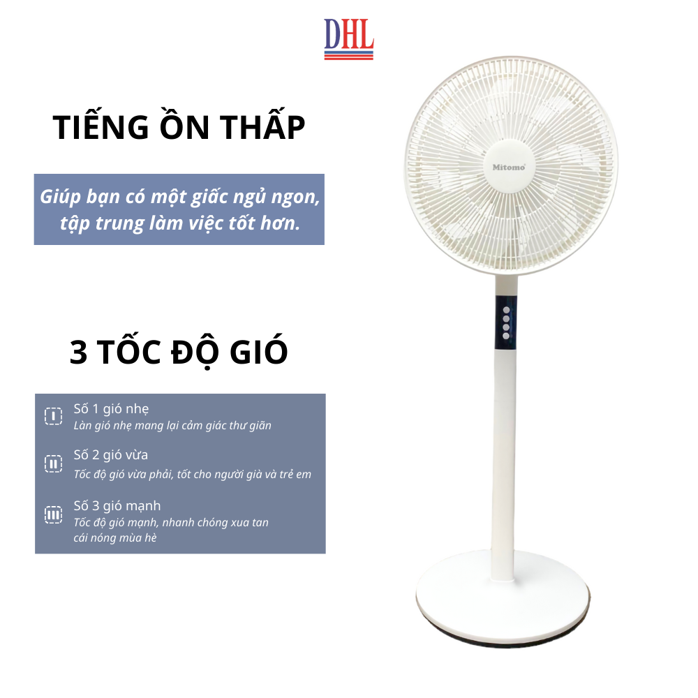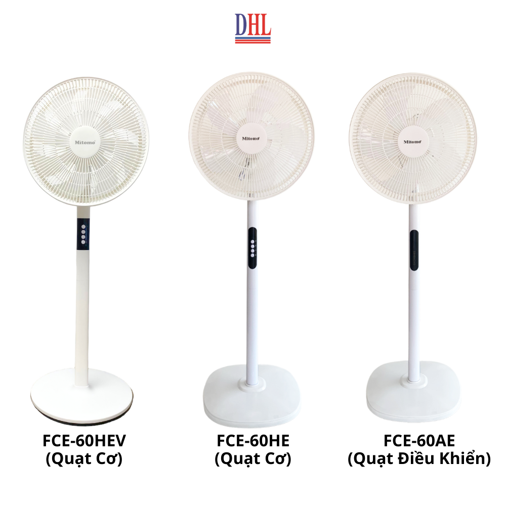 - Model FCE-60HEV: Quạt cơ, thân vuông, đế tròn, không có điều khiễn từ xa Quạt đứng Mitomo được thiết kế đơn giản, hiện đại với tông màu trắng chủ đạo. Thân quạt và lòng quạt được thiết kế từ nhựa ABS mang lại vẻ sang trọng và chắc chắn. Ba cấp độ gió cùng tính năng xoay đa hướng giúp gió phủ rộng và đều hơn. Tính năng nổi bật của quạt đứng Mitomo chính hãng