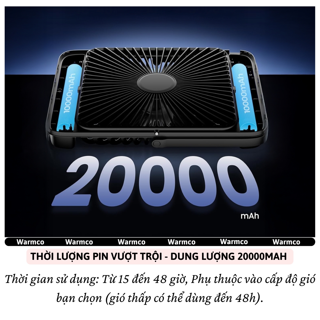 Sở hữu viên pin siêu khủng 20000mAh, Warmco D4 mang đến khả năng làm mát liên tục từ 15 đến 48 giờ chỉ với một lần sạc.