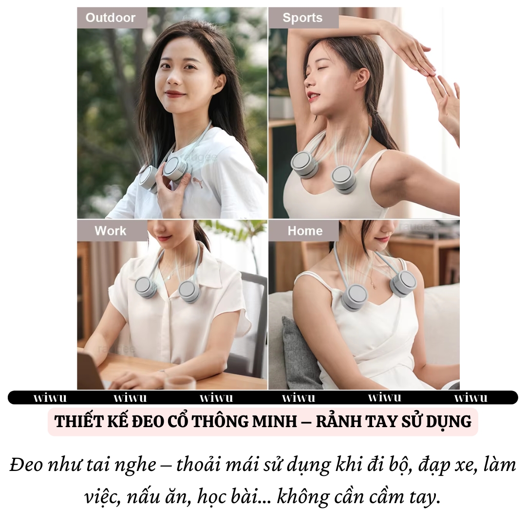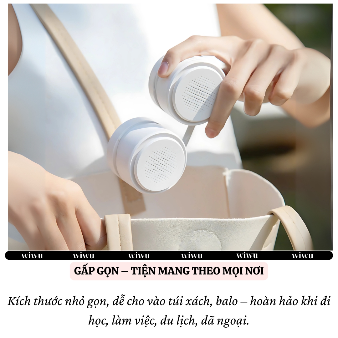 Mua tại Tiktok️ QUẠT ĐEO CỔ WIWU TWINS – MÁT LẠNH MỌI LÚC MỌI NƠI, NHẸ NHƯ KHÔNG! ️ Giải pháp làm mát cá nhân cực kỳ tiện lợi, thời trang & không vướng víu tay TÍNH NĂNG NỔI BẬT Thiết kế đeo cổ thông minh – rảnh tay sử dụng Đeo như tai nghe – thoải mái sử dụng khi đi bộ, đạp xe, làm việc, nấu ăn, học bài… không cần cầm tay. Gió mạnh như bão mini – 2 đầu quạt công suất cao Tạo luồng gió tốc độ cao làm mát nhanh – lý tưởng cho ngày hè oi bức hoặc hoạt động ngoài trời. Pin 1600mAh – Dùng liên tục 2–4 giờ Dung lượng pin lớn, sạc lại dễ dàng qua cổng Type-C, đảm bảo hoạt động ổn định trong thời gian dài. Cáp co rút linh hoạt – ôm sát cổ, dễ điều chỉnh Thiết kế dây đàn hồi, phù hợp nhiều kích cỡ cổ, thoải mái và không gây vướng víu. Êm ái, nhẹ nhàng – đeo lâu không mỏi Chất liệu nhẹ, thân thiện với da, cho cảm giác dễ chịu khi dùng cả ngày dài. Gấp gọn – tiện mang theo mọi nơi Kích thước nhỏ gọn, dễ cho vào túi xách, balo – hoàn hảo khi đi học, làm việc, du lịch, dã ngoại. Vận hành siêu êm – Độ ồn <30dB Chạy êm gần như không tiếng động – không gây phiền nhiễu khi làm việc, học tập hoặc nghỉ ngơi. THÔNG SỐ KỸ THUẬT
