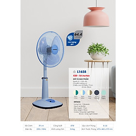 Model - L1638 • Màu sắc: Kem Cốm, Kem Môn, Kem Nâu, Xám Đồng, Xanh Ngọc • Dòng sản phẩm: Quạt Lỡ • Tốc độ gió: 3 tốc độ • Cánh quạt: 3 lá • Chuyển hướng cơ. • Chiều cao