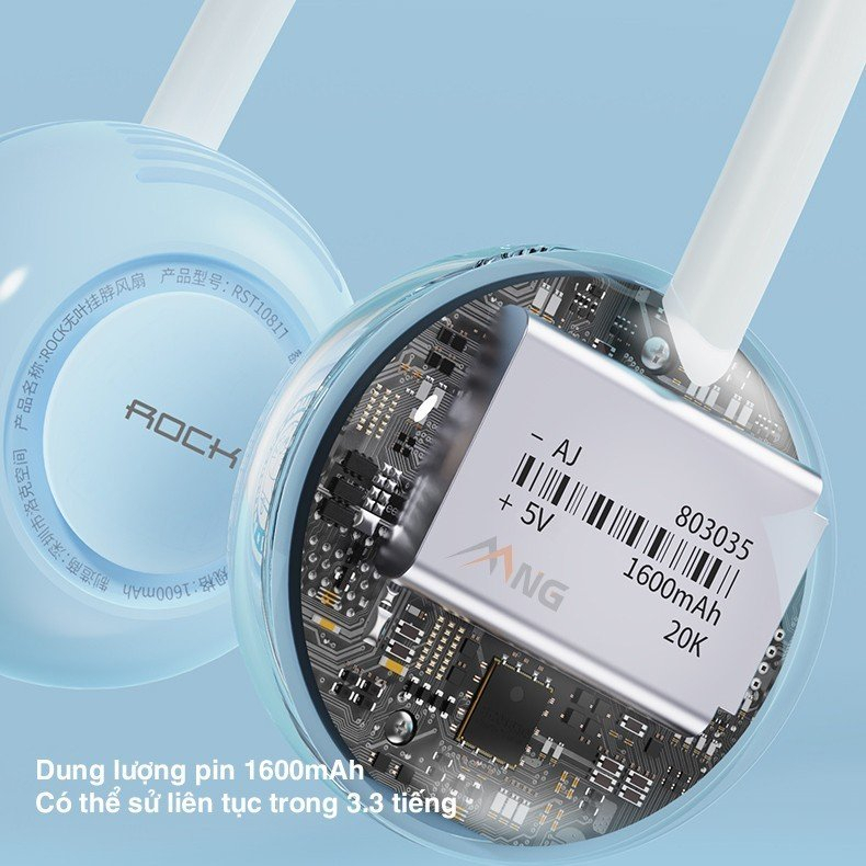 - Quạt mini đeo cổ sạc tích điện không cánh Rockspace pin tích điện, dung lượng pin 1600mAh sạc đầy trong 2h, thời gian sử dụng lên đến 5-6h