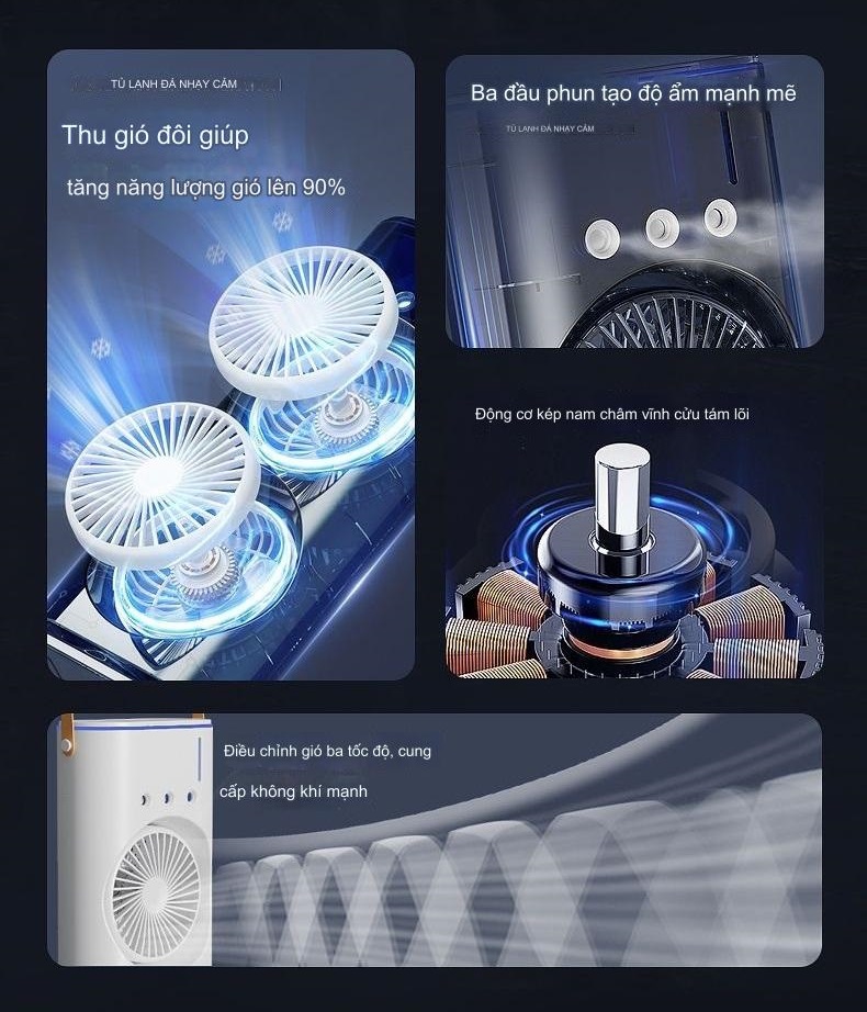 Đặc điểm nổi bật Quạt điều hòa có 2 hộp đá khô đi kèm giúp làm mát nhanh chóng Công suất 180W phù hợp làm mát diện tích 30m2 - 40m2 Độ ồn dưới mức