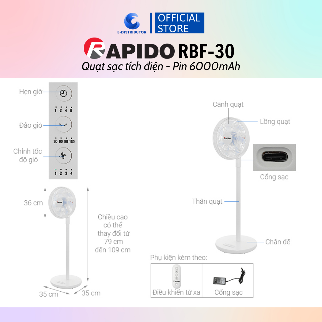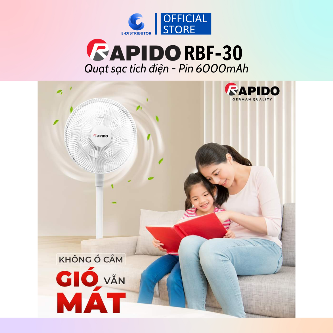 Quạt sạc điện có điều khiển Rapido RBF-30 (Pin 6000mAh) - 100% chính hãng 1. THÔNG SỐ KỸ THUẬT - Thương hiệu: Rapido - Thương hiệu của: Đức - Sản xuất tại: Việt Nam - Loại quạt: quạt sạc tích điện - quạt điều khiển (có remote) - Mã sản phẩm: RBF-30 - Điện áp: 220V - Công suất: 30W - Chế độ gió: Gió thường - Thời gian: + Thời gian sạc 6 giờ 45 phút + Thời gian sử dụng: lên đến 27 giờ - Bảng điều khiển:: Remote/Nút nhấn - Loại motor: Bạc đạn - Đường kính cánh quạt: 7 cánh - 30 cm - Chiều dài dây điện: 149 cm - Tiện ích: + Có remote + Hẹn giờ tắt + Điều chỉnh được chiều cao + Lồng quạt có khe hở nan quạt nhỏ + Có đèn báo khi sạc - Kích thước, khối lượng: Ngang 35 cm - Cao 79 - 109 cm - Sâu 35 cm - Nặng 5.5 kg - Bảo hành: 12 tháng về lỗi kỹ thuật 2. MÔ TẢ SẢN PHẨM - Ưu điểm sản phẩm: + Mẫu quạt sạc này sở hữu vẻ ngoài thời trang, màu trắng thanh lịch, thích hợp dùng trong không gian phòng diện tích nhỏ hoặc vừa: phòng ngủ, phòng đọc sách,... + Rapido RBF-30 có thể quay 180°, đưa gió lan tỏa nhiều hướng, làm mát hiệu quả. Bạn có thể điều chỉnh độ quay của quạt: 30°, 60°, 90°, 180°. + Có thể điều chỉnh độ cao quạt từ 79 cm đến 109 cm. + Lồng quạt có khe hở nan quạt nhỏ, đảm bảo an toàn khi sử dụng. + 7 cánh quạt đường kính 30 cm tạo làn gió mát trong phạm vi vừa và nhỏ. + Thời gian sạc khoảng 6 giờ 45 phút, sử dụng khoảng 27 giờ tùy theo tốc độ gió. - Quạt Rapido RBF-30 trang bị motor bạc đạn giúp quạt hoạt động bền bỉ, êm ái. - Công suất hoạt động 30W làm mát hiệu quả ở không gian vừa và nhỏ, tiết kiệm điện.