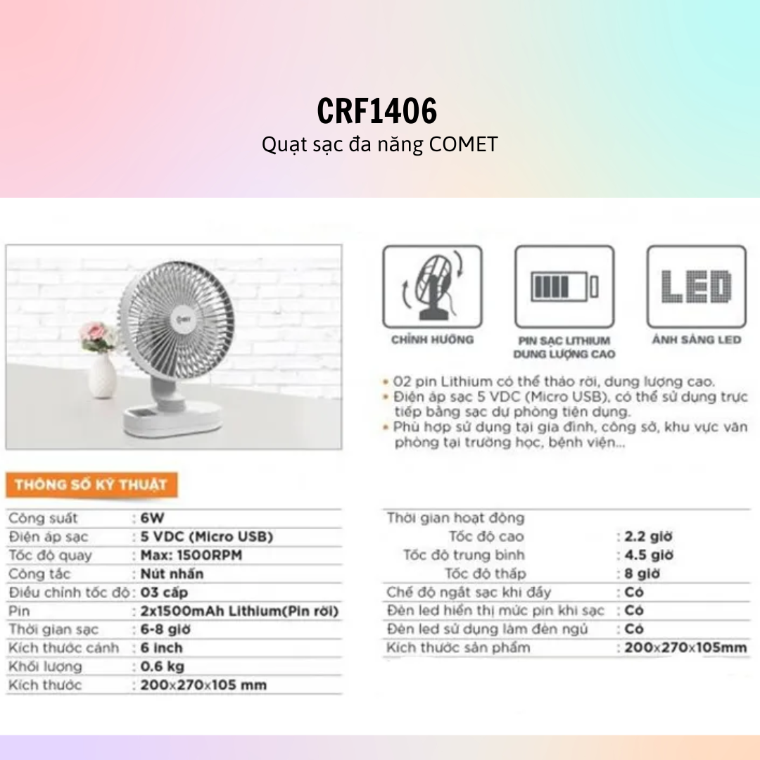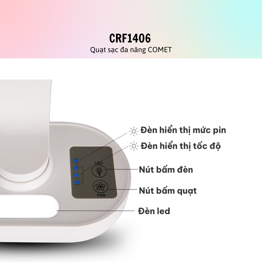 Quạt tích điện mini đa năng kết hợp đèn led CÓ THỂ CẮM TRỰC TIẾP SẠC DỰ PHÒNG Comet CRF1406