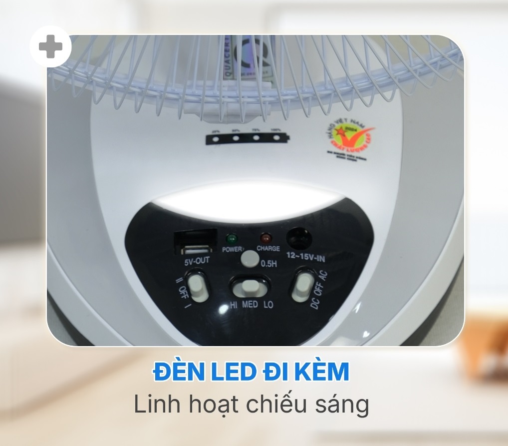 QUẠT ĐỂ BÀN CÓ SẠC TÍCH ĐIỆN ĐÈN LED PF-QB2180 Cấp độ gió:3 mức Chất liệu:Nhựa Abs Thời gian sử dụng:3 - 5H (tùy vào điều kiện sử dụng) Nguồn điện:DC 5v/2A Công suất:5W Số