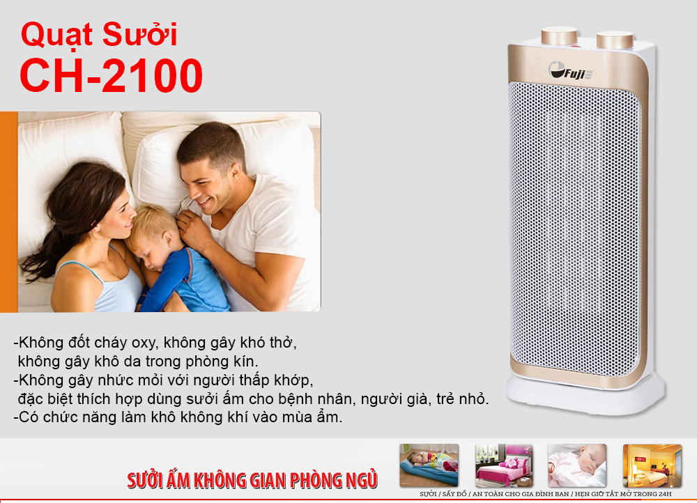 Với thiết kế đặc biệt nhỏ gọn máy sưởi gốm FujiE CH-2100 rất phù hợp sử dụng cho sưởi ấm cá nhân, gia đình, phòng làm việc có diện tích vừa phải.