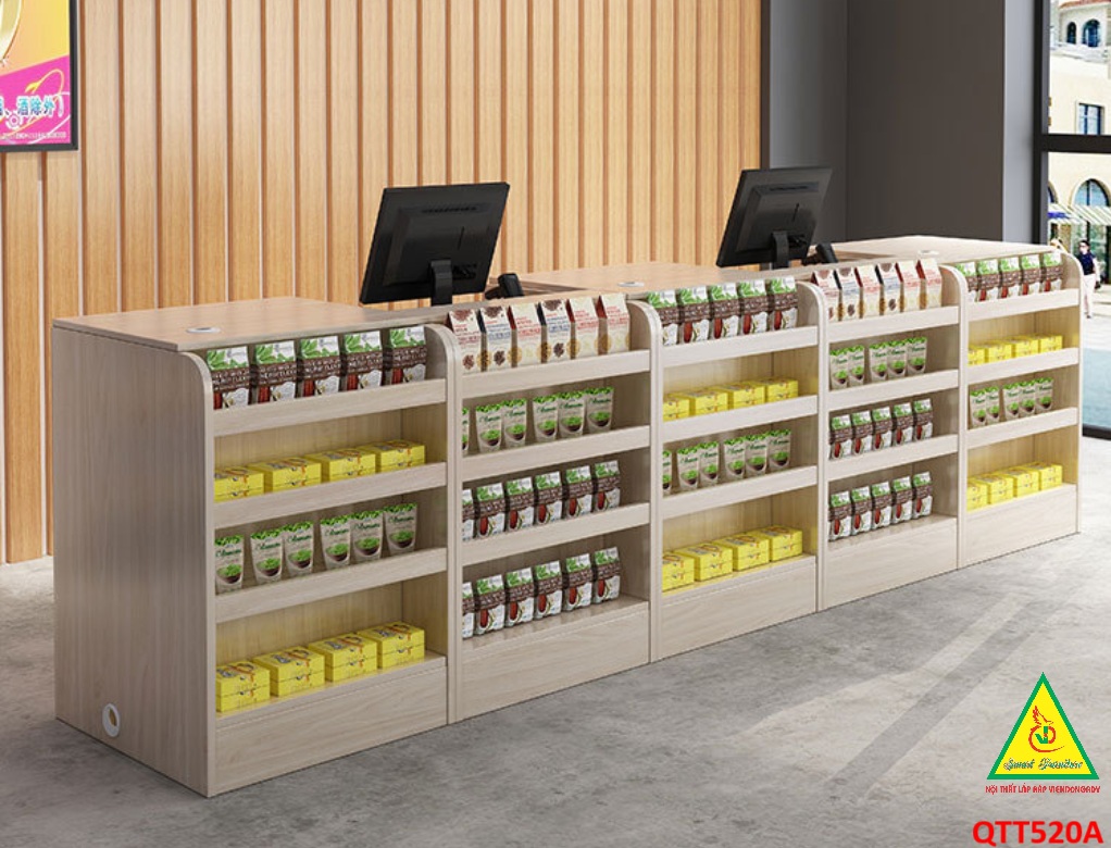 Quầy thu ngân là một giải pháp tuyệt vời cho các cửa hàng bán lẻ, tạp hóa,… Không chỉ đơn thuần là một quầy tính tiền mà còn có thể tích hợp các chức năng khác như trưng bày sản phẩm nhằm mục đích kích cầu. Thiết kế đa năng giúp tiết kiệm không gian và tăng hiệu quả làm việc.