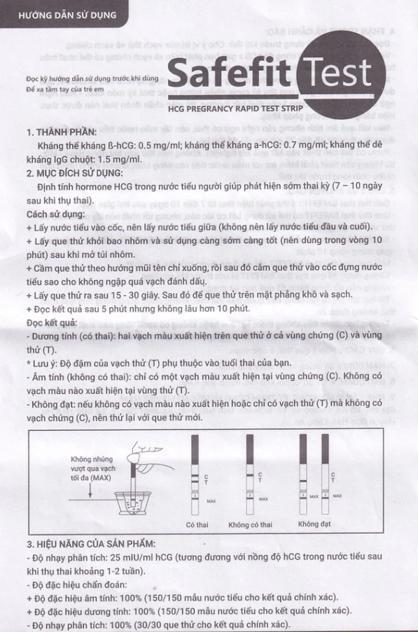 - Kháng thể đề kháng IgG chuột: 1.5 mg/ml. Hiệu năng của sản phẩm Độ nhạy phân tích: 25 mlU/ml hCG (tương đương với nồng độ hCG trong nước tiểu sau khi thụ thai khoảng 1 - 2 tuần). Độ đặc hiệu chẩn đoán: Độ đặc hiệu âm tính: 100% (150/150 mẫu nước tiểu cho kết quả chính xác). Độ đặc hiệu dương tính: 100% (150/150 mẫu nước tiểu cho kết quả chính xác). Độ nhạy phân tích: 100% (30/30 que thử cho kết quả chính xác). Cách dùng: