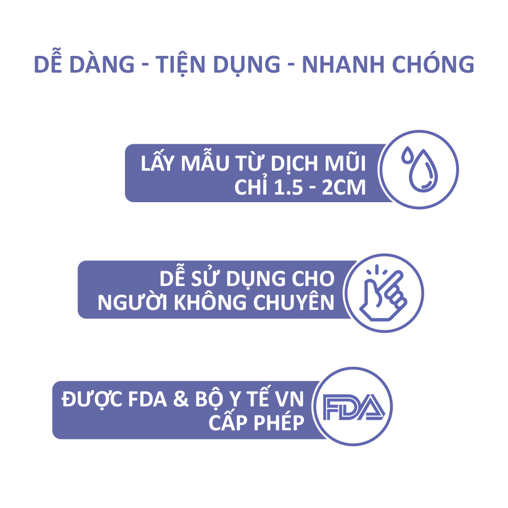 - Đây là sản phẩm tự xét nghiệm bằng cách sử dụng tăm bông lấy dịch mũi: Tự lấy mẫu đối với các cá nhân có độ tuổi từ 14 tuổi trở lên hoặc cần người lớn hỗ trợ đối với các cá nhân có độ tuổi từ 2 tuổi trở lên