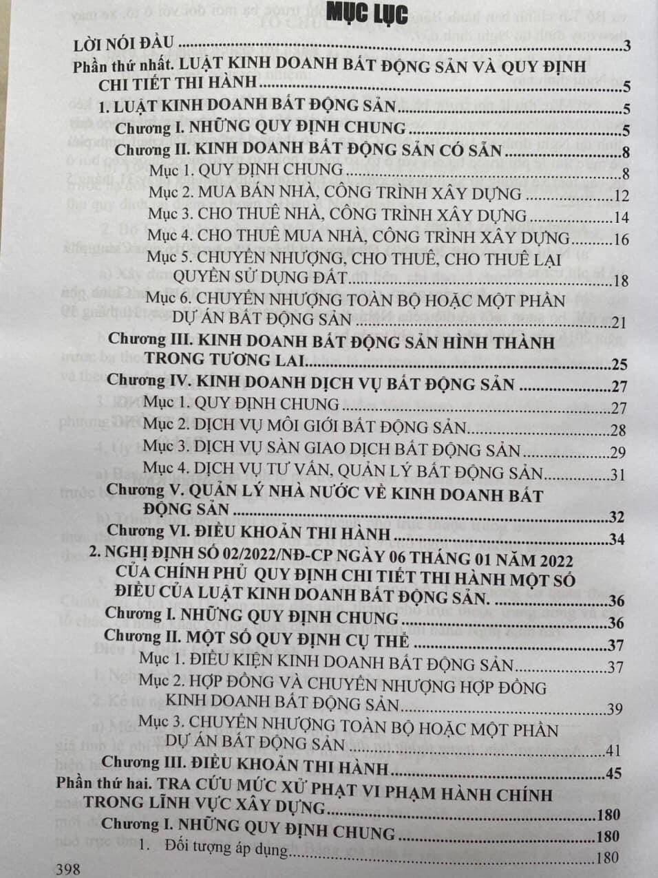 Quy Định Chi Tiết Thi Hành Luật Kinh Doanh Bất Động Sản Nhà xuất bản: Hồng Đức Tác giả: Quốc Hội Khổ sách: 28*20 cm Giá bía: 395.000 đ Loại bìa: Bìa mềm Số trang 400 Ngày 06 tháng 01 năm 2022, Chính phủ đã ban hành Nghị định số 02/2022/NĐ-CP quy định chi tiết thi hành một số điều của Luật Kinh doanh bất động sản, có hiệu lực từ ngày 01/03/2022 với nhiều nội dung quan trọng quy định chi tiết một số điều, khoản của Luật Kinh doanh bất động sản. Nhằm giúp quý độc giả nắm bắt những quy định nêu trên Nhà xuất bản Hồng Đức xuất bản cuốn sách: Quy Định Chi Tiết Thi Hành Luật Kinh Doanh Bất Động Sản (theo Nghị định số 02/2022/NĐ-CP ngày 06 tháng 01 năm 2022)   Nội dung cuốn sách bao gồm những nội dung sau: Phần thứ nhất. LUẬT KINH DOANH BẤT ĐỘNG SẢN VÀ QUY ĐỊNH CHI TIẾT THI HÀNH Phần thứ hai. TRA CỨU MỨC XỬ PHẠT VI PHẠM HÀNH CHÍNH TRONG LĨNH VỰC XÂY DỰNG Phần thứ ba. PHÁP LUẬT VỀ NHÀ Ở VÀ CÁC QUY ĐỊNH LIÊN QUAN ĐẾN GIAO DỊCH BẤT ĐỘNG SẢN Phần thứ tư. PHÒNG, CHỐNG RỬA TIỀN TRONG LĨNH VỰC KINH DOANH BẤT ĐỘNG SẢN Phần thứ năm. QUY ĐỊNH MỚI VỀ LỆ PHÍ TRƯỚC BẠ NHÀ, ĐẤT