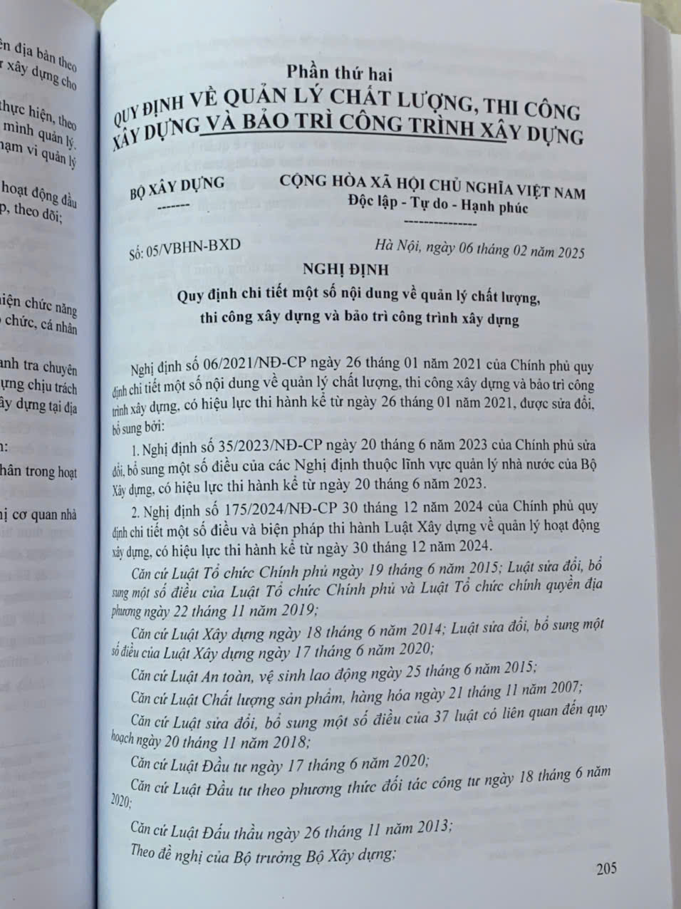 Thời gian qua Quốc hội, Chính phủ và Bộ ngành đã ban hành nhiều văn bản Luật liên quan đến Luật Xây dựng và nhiều Nghị định mới như: Nghị định số 175/2024/NĐ-CP ngày 30 tháng 12 năm 2024 quy định chi tiết một số điều và biện pháp thi hành Luật Xây dựng về quản lý hoạt động xây dựng. Thông tư số 10/2024/TT-BXD ngày 01 tháng 11 năm 2024 của Bộ Xây dựng về quản lý chất lượng sản phẩm, hàng hóa vật liệu xây dựng. Thông tư số 02/2024/TT-BXD ngày 20 tháng 5 năm 2024 của Bộ Xây dựng hướng dẫn xác định và quản lý chi phí quy hoạch chi tiết theo quy trình rút gọn… Nhằm có tài liệu tuyên truyền những quy định pháp luật mới trên đến các cơn quan, đơn vị, doanh nghiệp và cá nhân liên quan có tài liệu tham khảo áp dụng trong công việc Nhà xuất bản Hồng Đức xuất bản cuốn sách:
