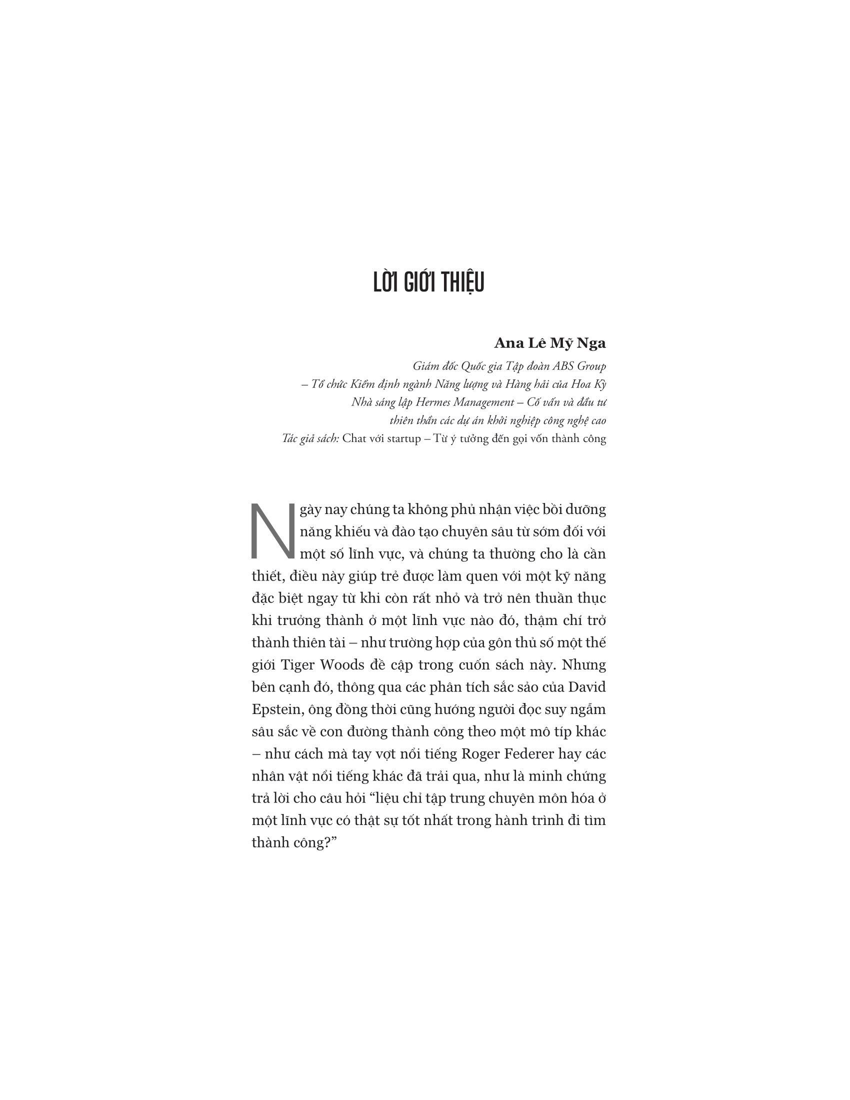 David Epstein đã kiểm tra các vận động viên, nghệ sĩ, nhạc sĩ, nhà phát minh, nhà dự báo và nhà khoa học thành công nhất thế giới. Ông phát hiện ra rằng trong hầu hết các lĩnh vực – đặc biệt là những lĩnh vực phức tạp và khó đoán – những người có tư duy tổng quát (chứ không phải chuyên gia) đều có tố chất xuất sắc. Những người theo chủ nghĩa tổng quát thường tìm ra con đường của m.ình muộn và họ có nhiều mối quan tâm hơn là tập trung vào một. Họ cũng sáng tạo hơn, nhanh nhẹn hơn và có thể tạo ra những kết nối mà những đồng nghiệp chuyên môn hóa không thể nhìn thấy.