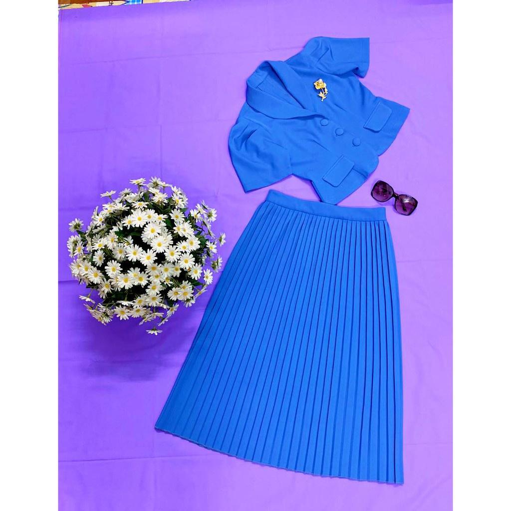 Rập được ôp lên vải và cắt. Dài áo 50-55cm tùy sz, dài váy 42-45cm tùy sz. Hình váy xanh dài xếp ly do khách may từ rập.