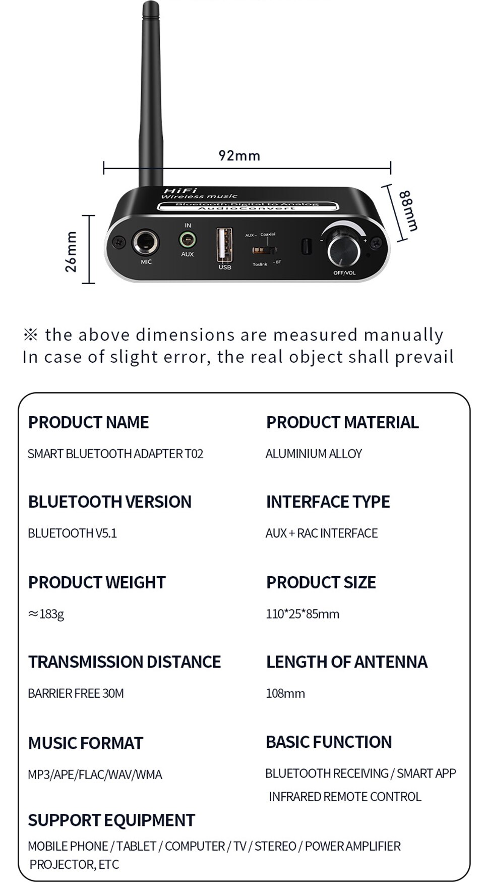 Tính năng: Bộ thu âm thanh tương thích với Bluetooth, bộ chuyển đổi âm thanh kỹ thuật số sang tương tự, bộ điều hợp phát lại đĩa flash USB. Có dây thành không dây, biến