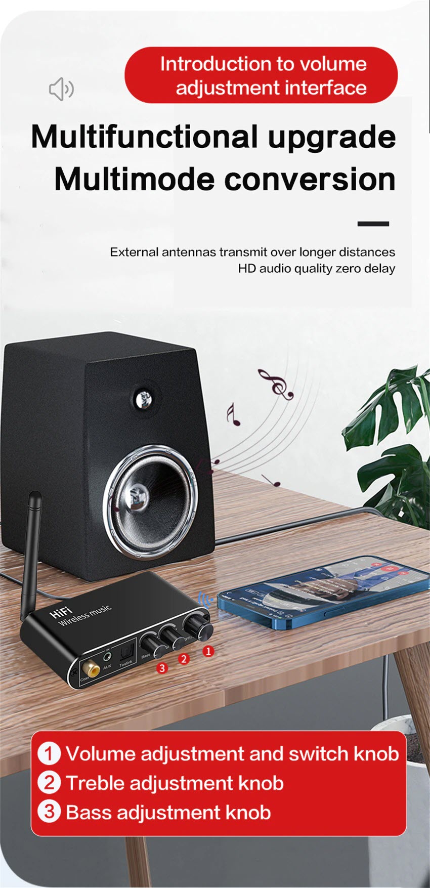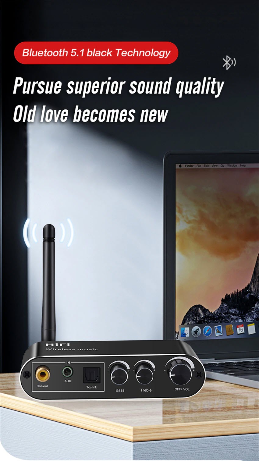 Tính năng: Bộ thu âm thanh tương thích với Bluetooth, bộ chuyển đổi âm thanh kỹ thuật số sang tương tự, bộ điều hợp phát lại đĩa flash USB. Có dây thành không dây, biến