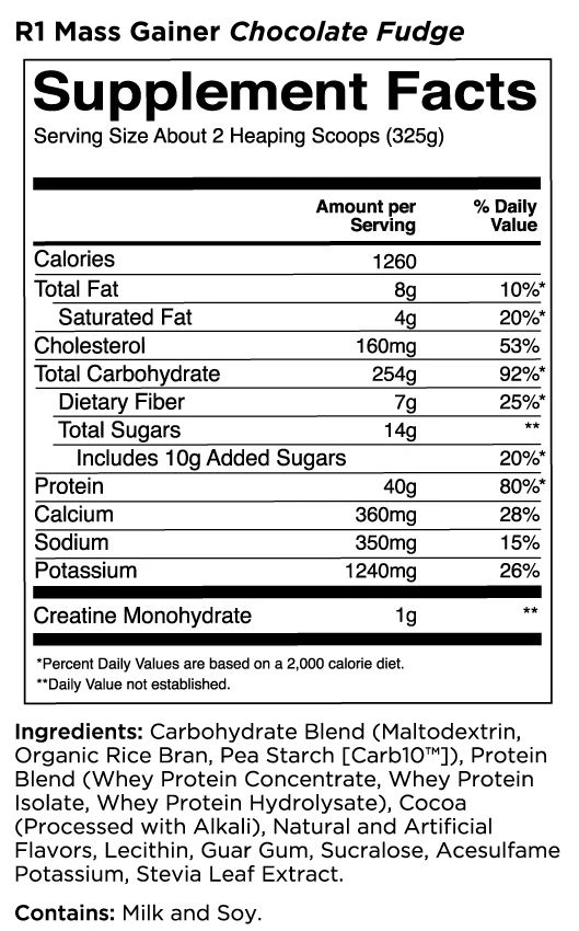 • R1 mass Gainer được thiết kế bởi Rule 1, một thương hiệu tiên phong trong những nghiên cứu sản xuất các sản phẩm cao cấp nhằm mục tiêu tăng cơ, tăng cân đột phá những điều gần như là không thể trong lĩnh vực tăng cân.